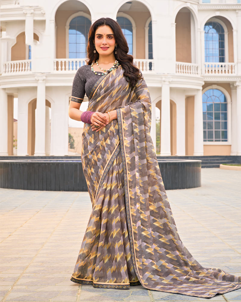 Vishal Prints Charcoal Grey And Tan Printed Fancy Chiffon Saree With Fancy Border