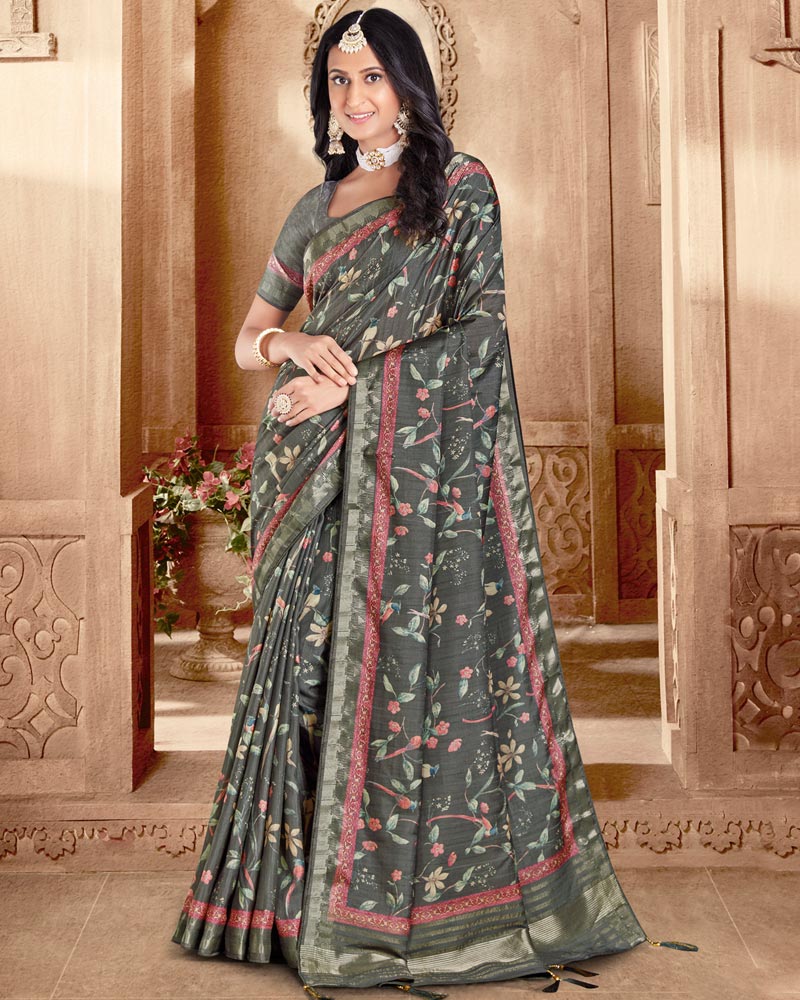 Vishal Prints Charcoal Grey Designer Poly Cotton Saree With Weaved Border And Tassel