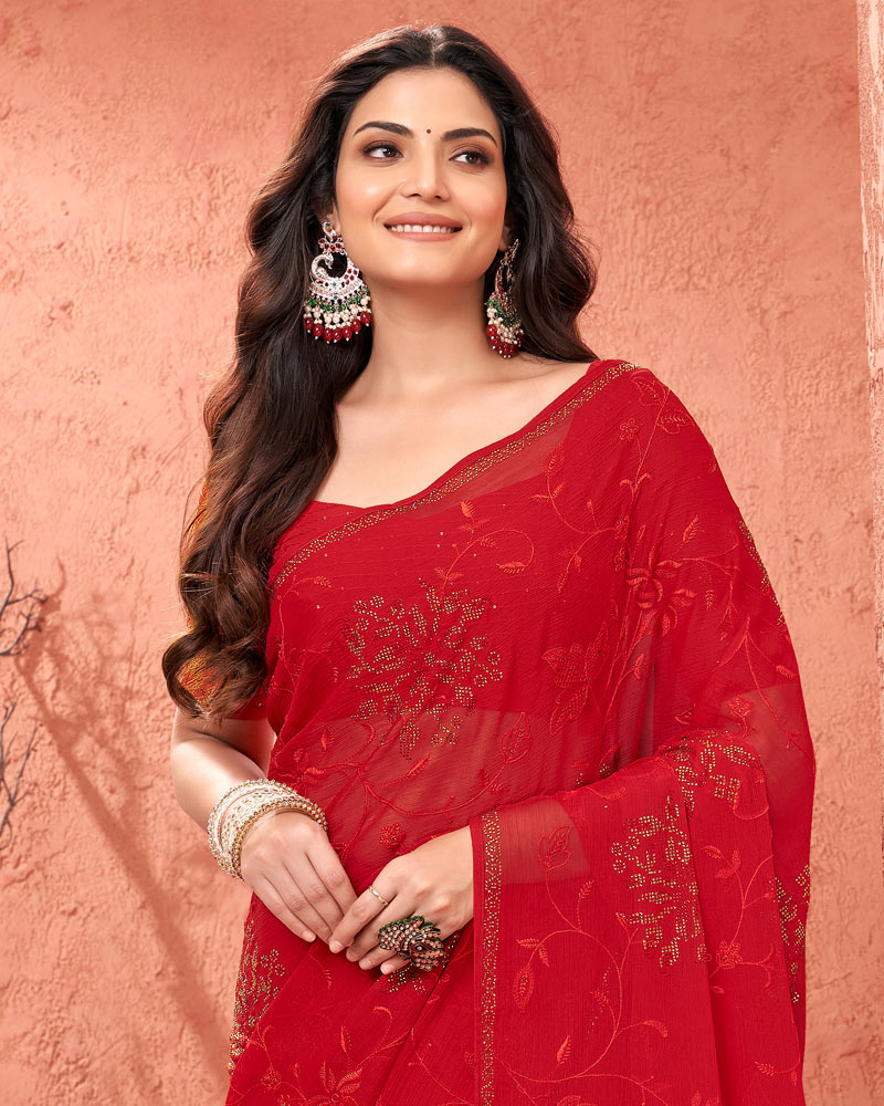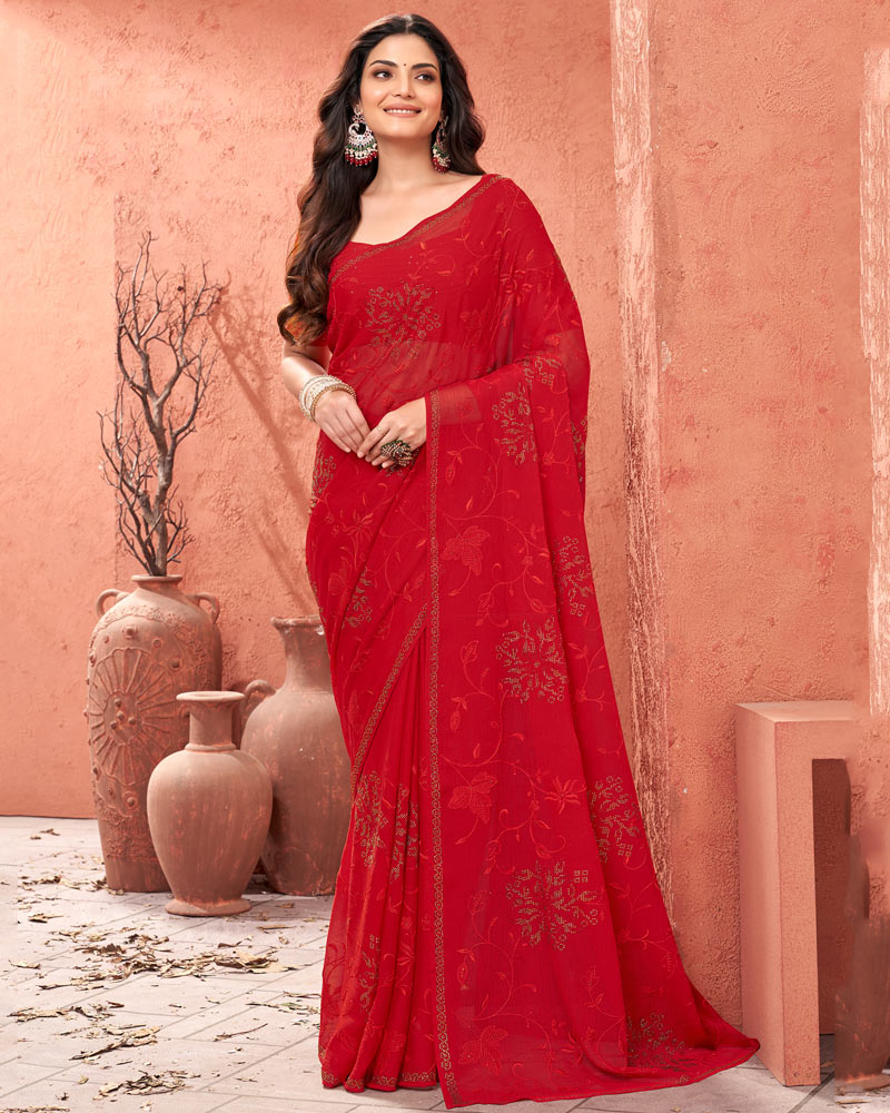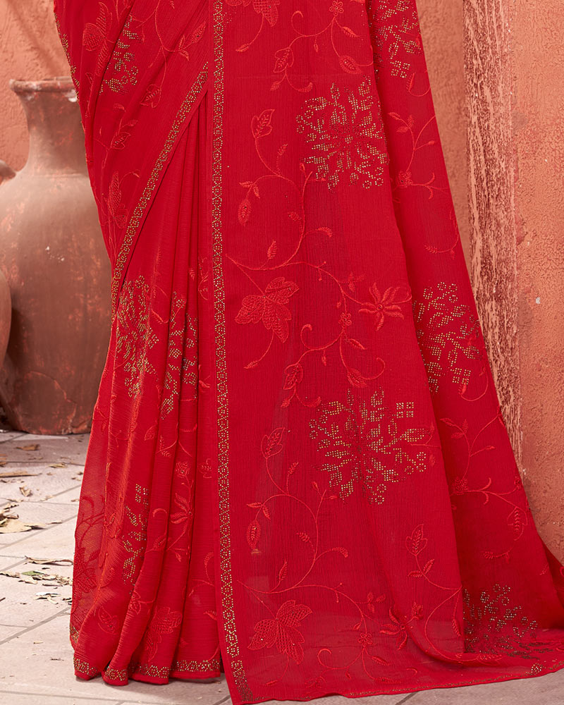 Vishal Prints Cherry Red Designer Chiffon Saree With Embroidery Diamond Work And Core Piping