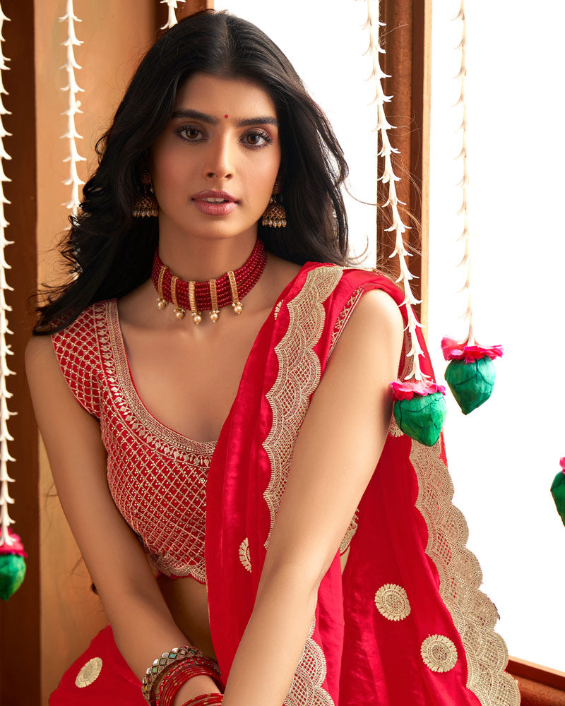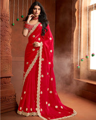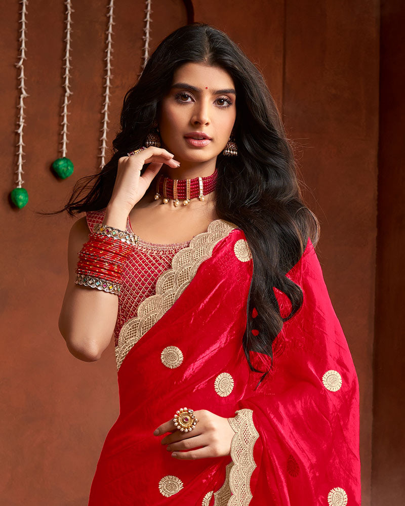 Vishal Prints Cherry Red Fancy Satin Saree With Embroidery-Zari Butta And Cut Work Border