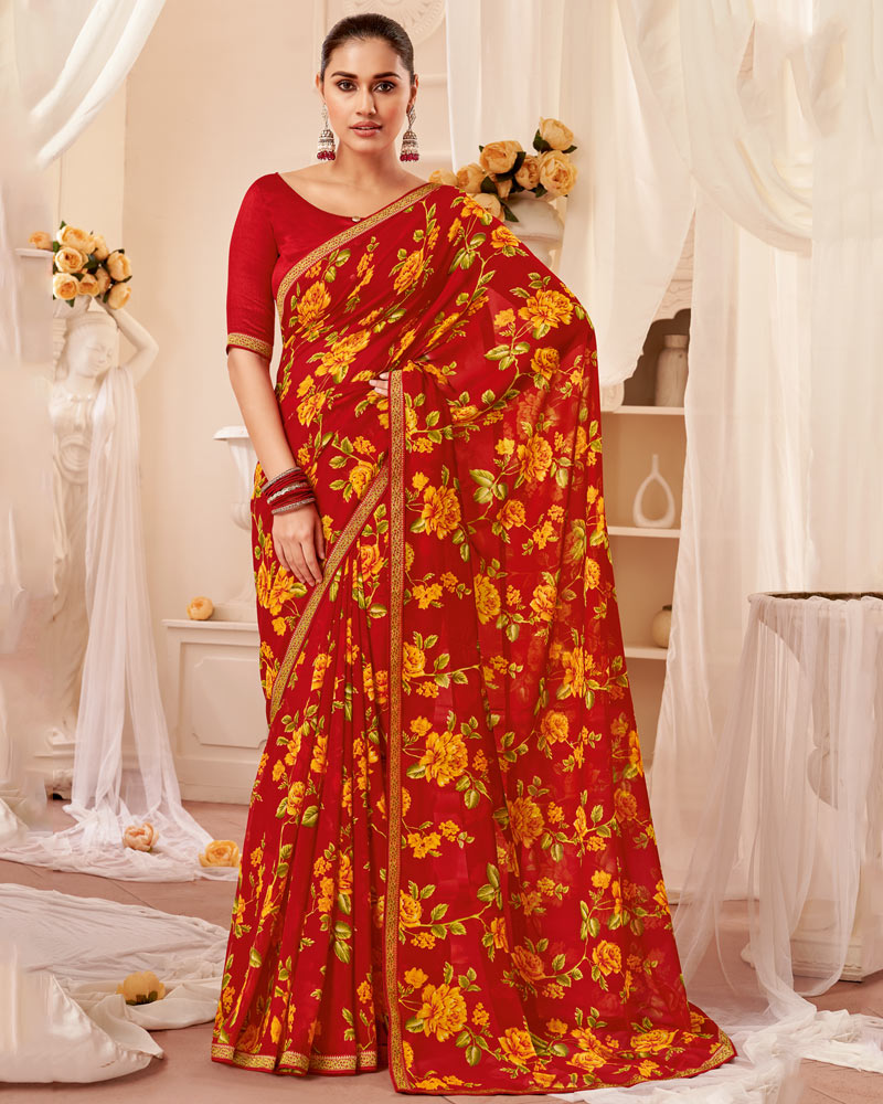 Vishal Prints Cherry Red Printed Georgette Saree With Fancy Border