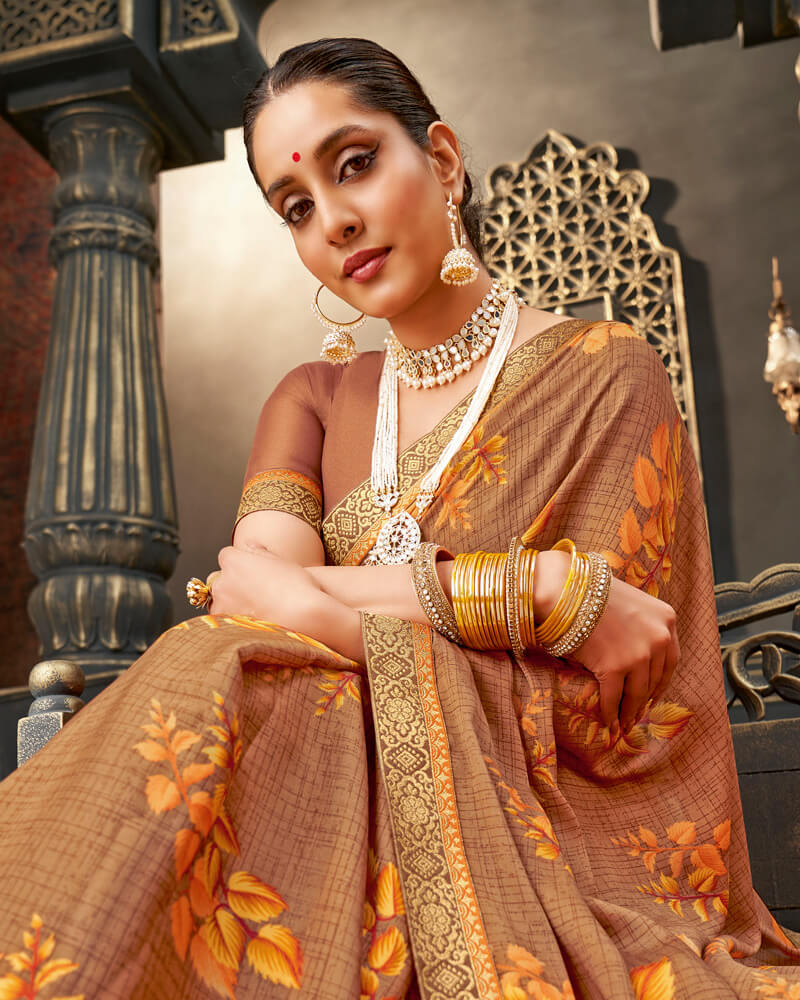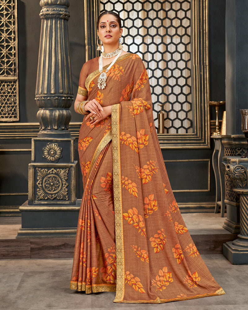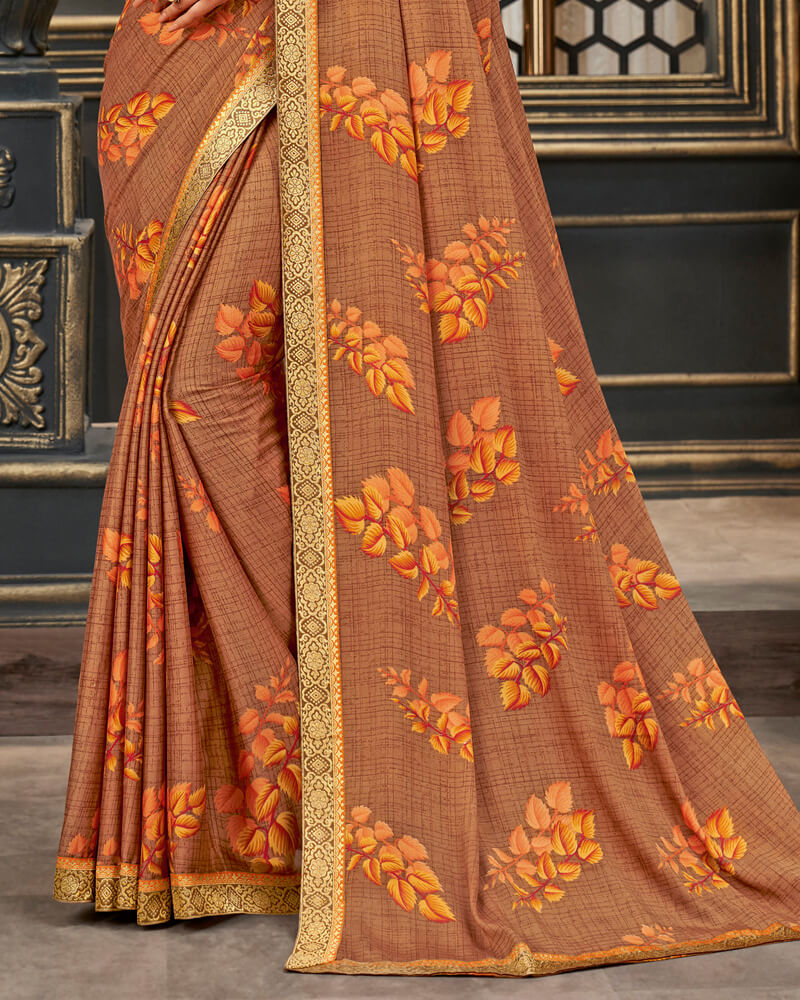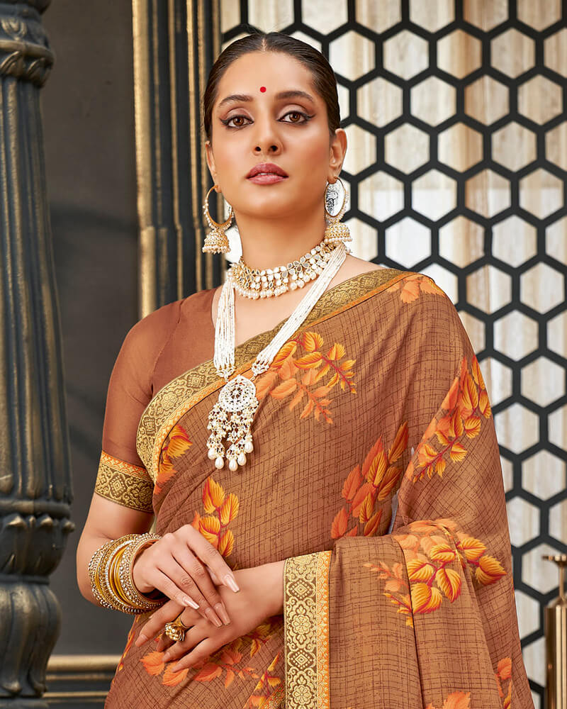 Vishal Prints Coffee Brown Printed Crepe Saree With Border
