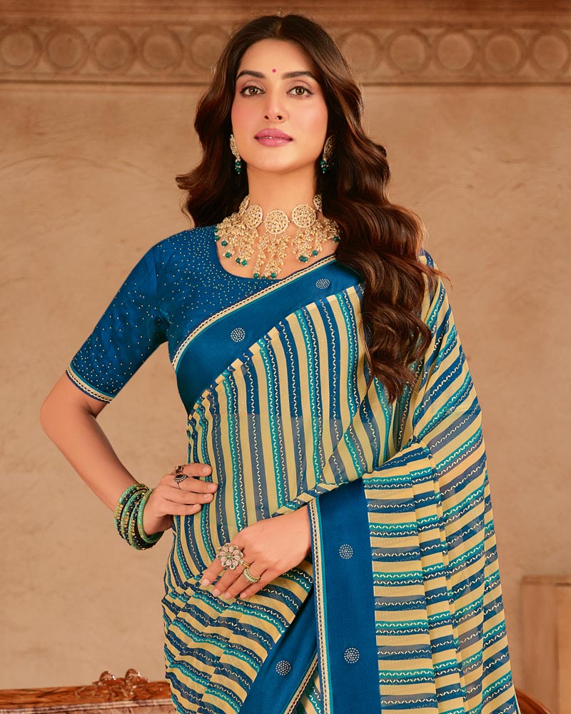 Vishal Prints Cream Printed Chiffon Saree With Foil Print-Diamond Work And Gota Patti Border