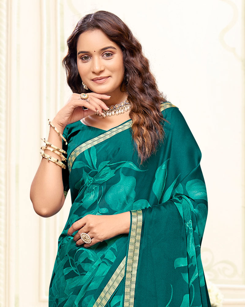 Vishal Prints Dark Aqua Green Printed Criva Crepe Saree With Weaved Viscose Patta
