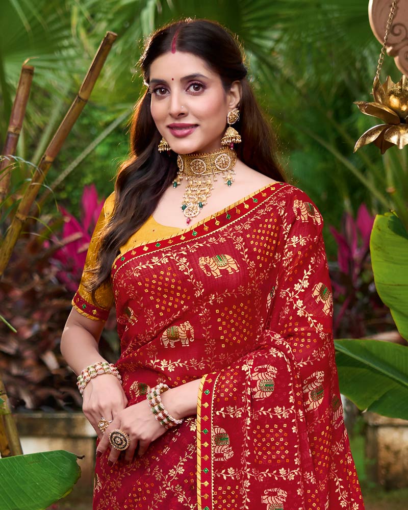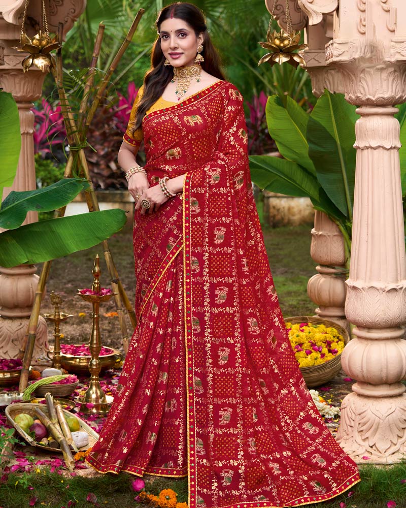 Vishal Prints Dark Brick Red Printed Chiffon Bandhani Print Saree With Foil Print And Fancy Border