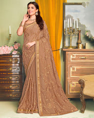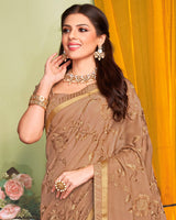 Vishal Prints Dark Brown Chiffon Saree With Embroidery Work And Fancy Zari Border