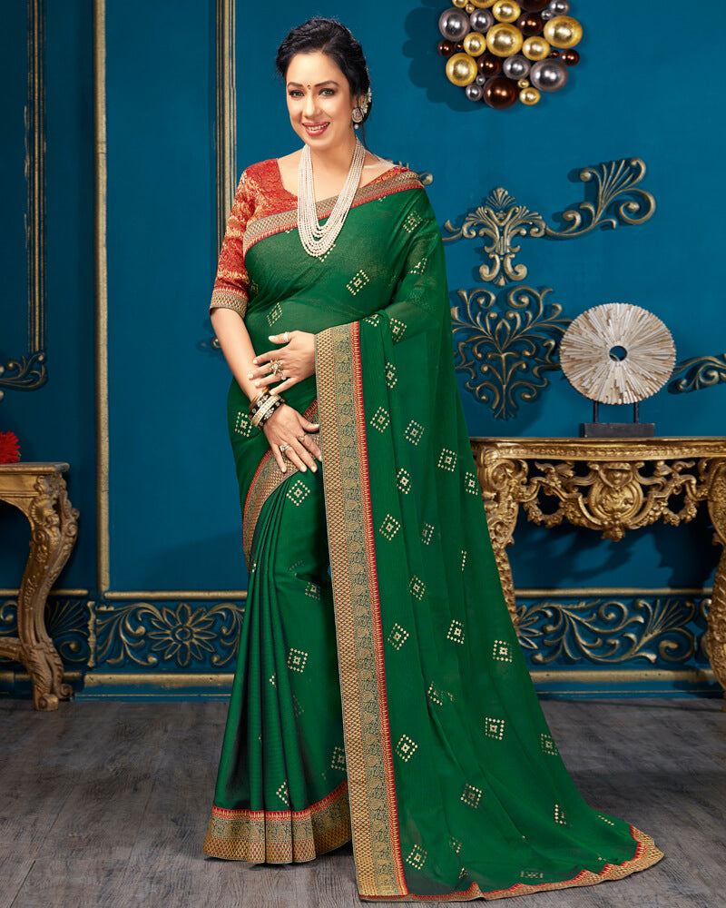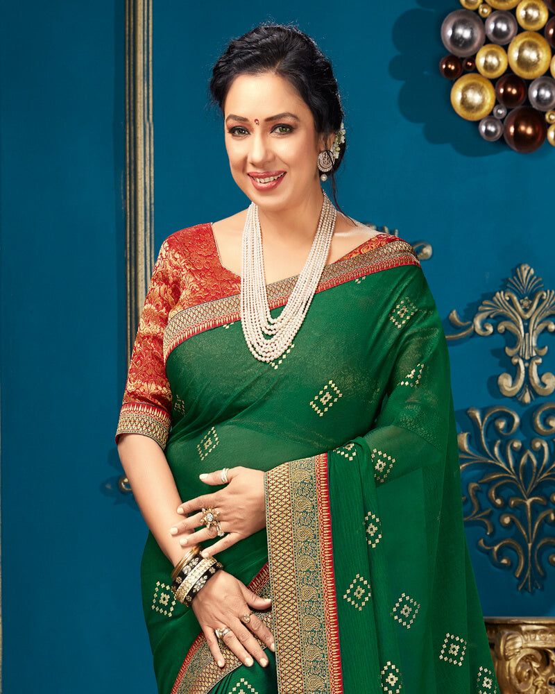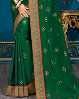 Vishal Prints Dark Green Chiffon Saree With Foil Print And Jari Border