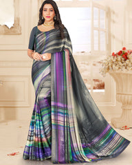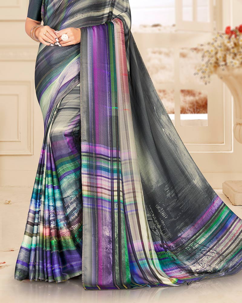 Vishal Prints Dark Grey Digital Print Satin Saree With Stone Diamond Work And Core Piping