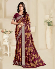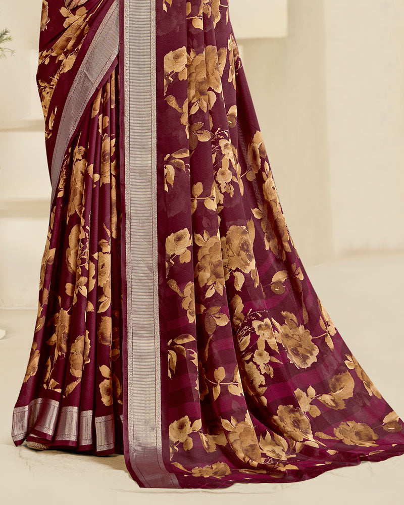 Vishal Prints Dark Maroon Printed Criva Crepe Saree With Weaved Viscose Patta
