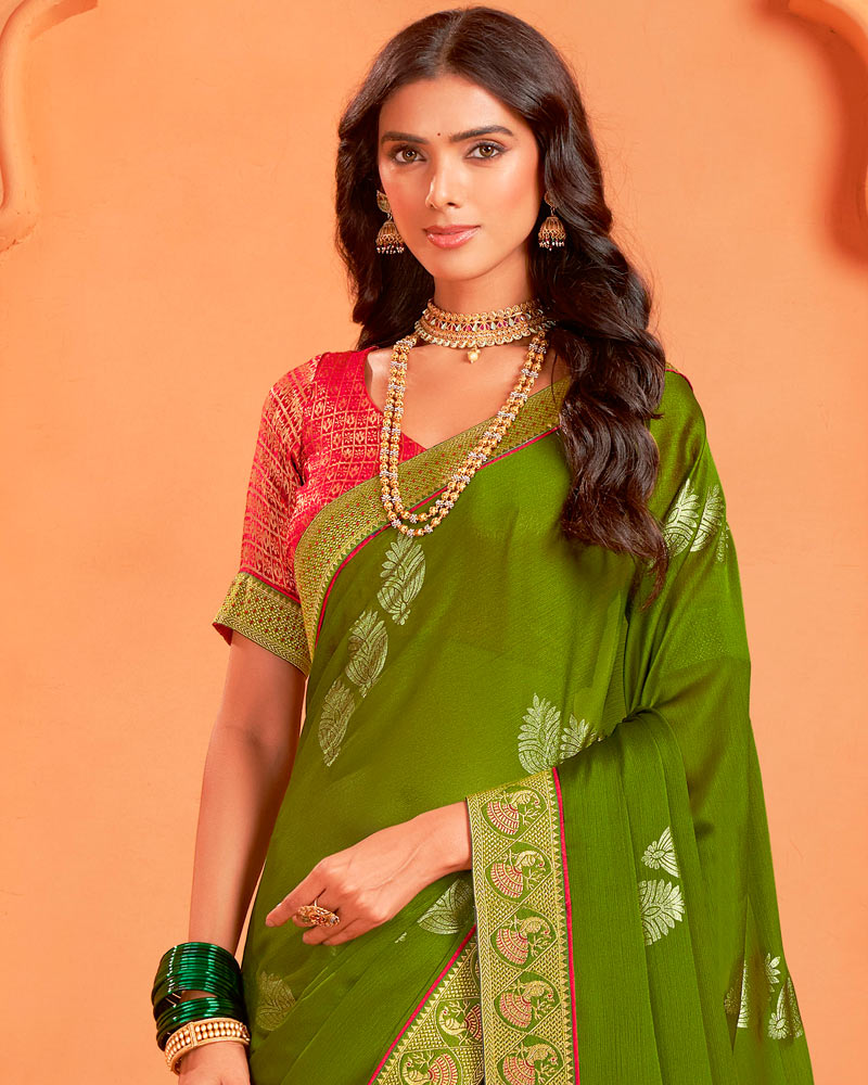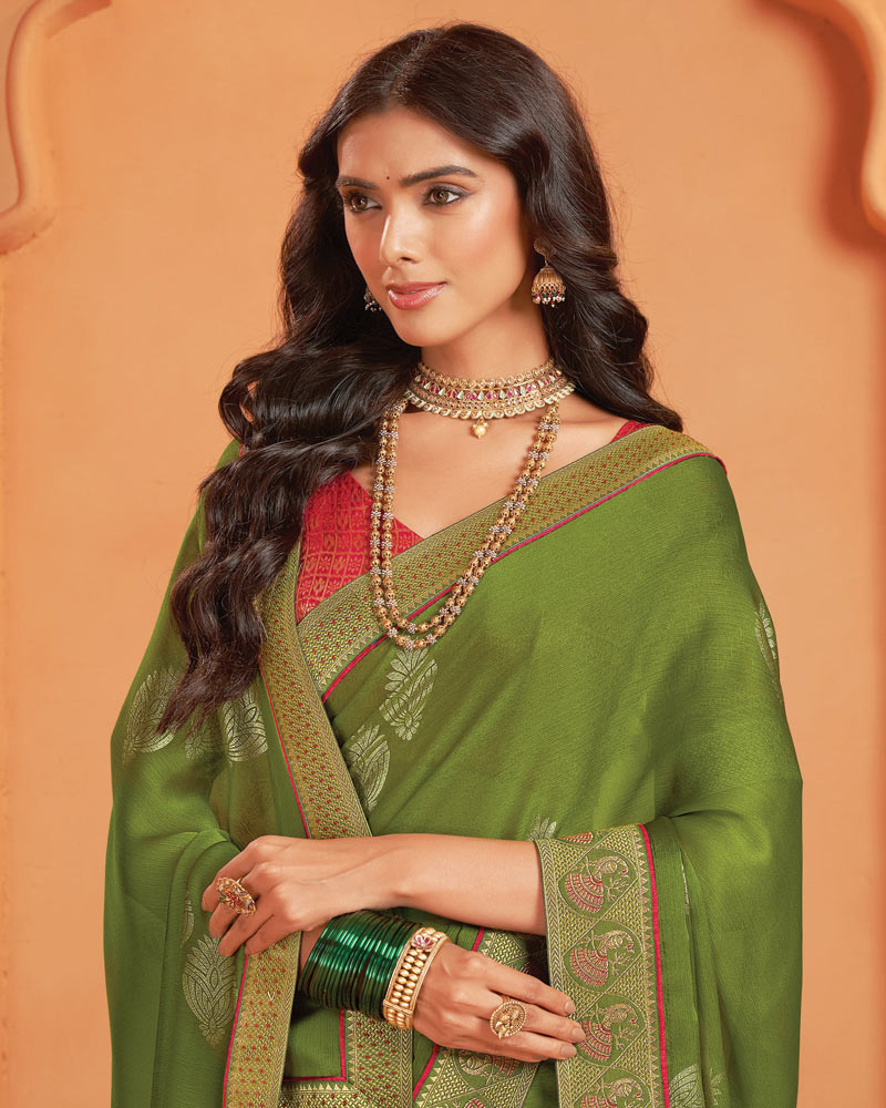 Vishal Prints Dark Mehandi Green Designer Chiffon Saree With Foil Print And Zari Border