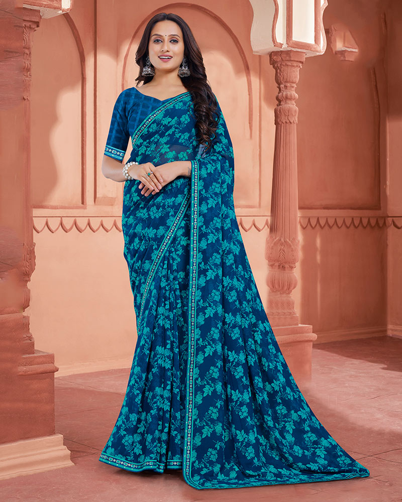 Vishal Prints Dark Midnight Blue Printed Georgette Saree With Fancy Border