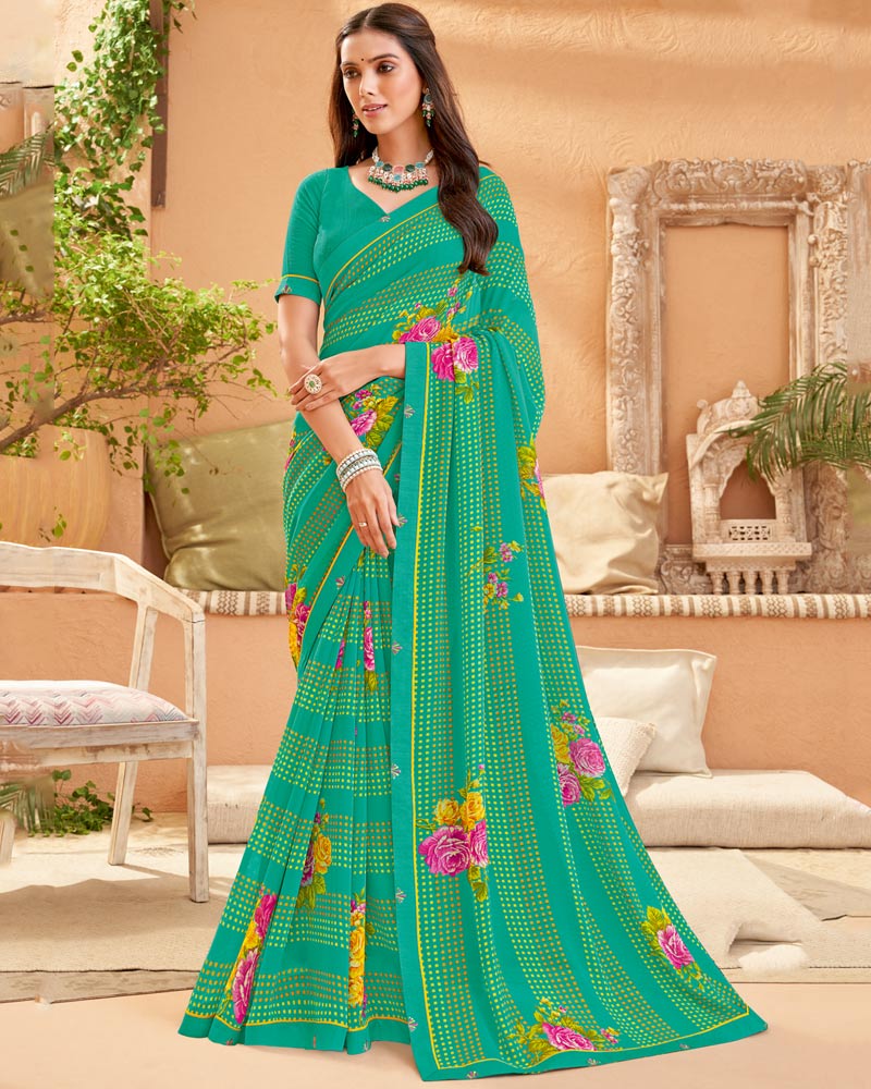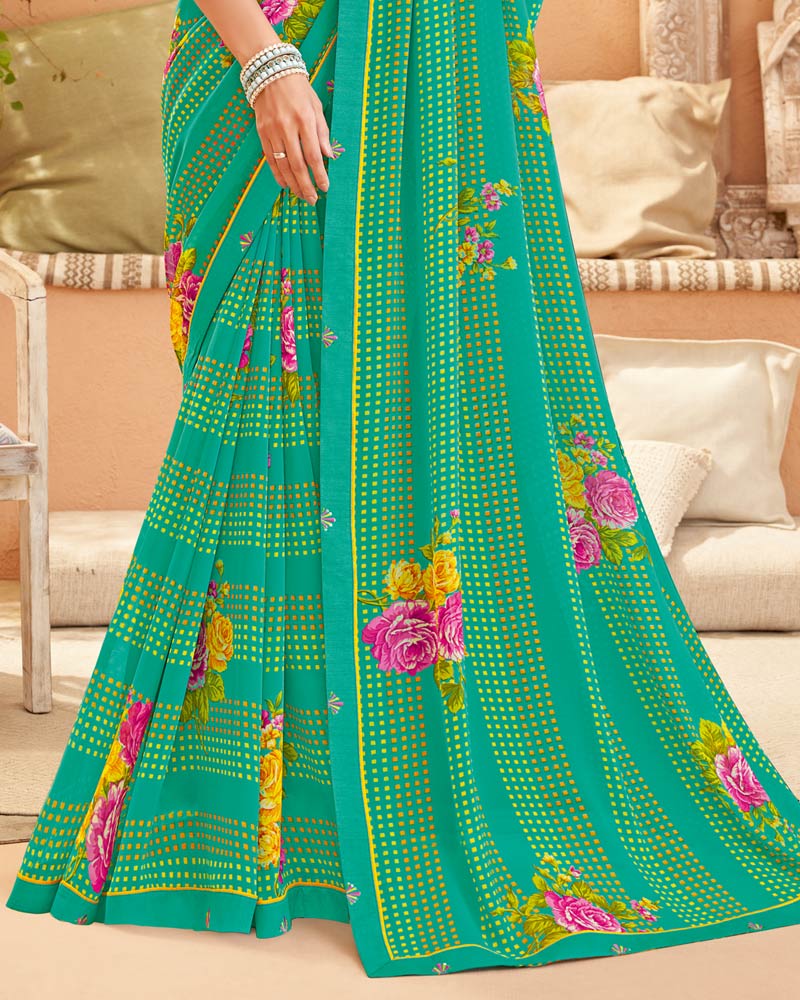 Vishal Prints Dark Mint Green Printed Georgette Saree With Fancy Border