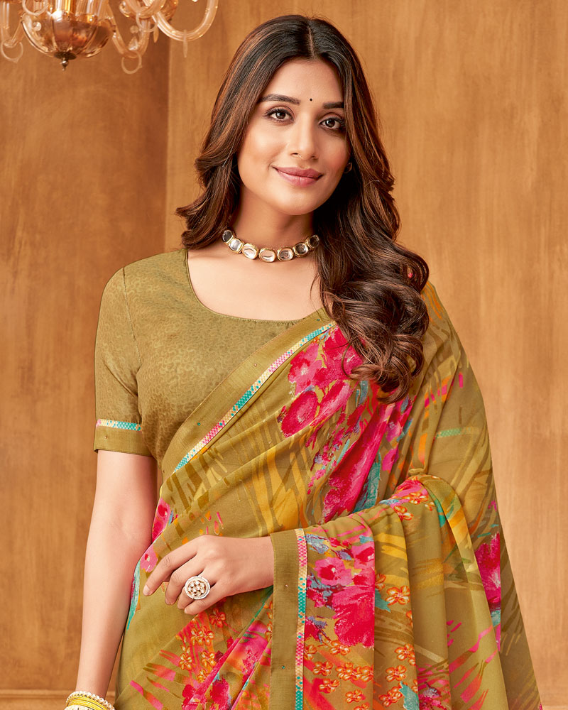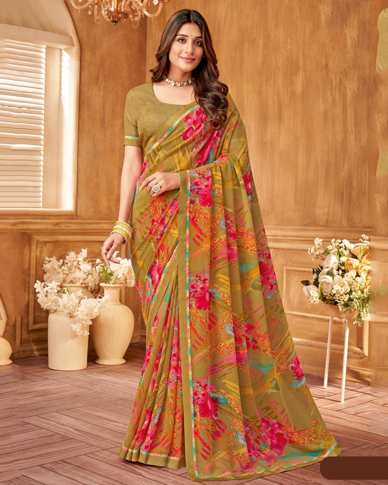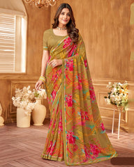 Vishal Prints Dark Mustard Printed Georgette Saree With Fancy Border