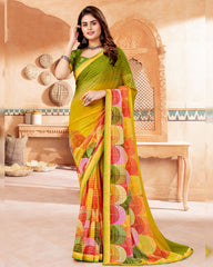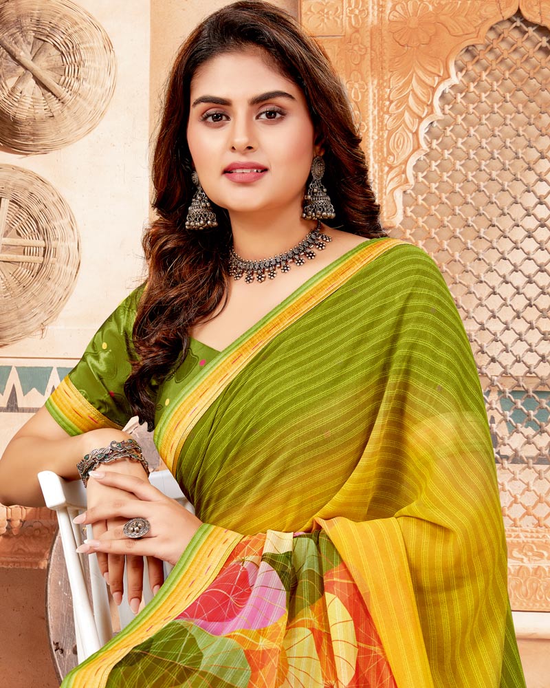 Vishal Prints Dark Olive Green Digital Print Georgette Saree With Fancy Border
