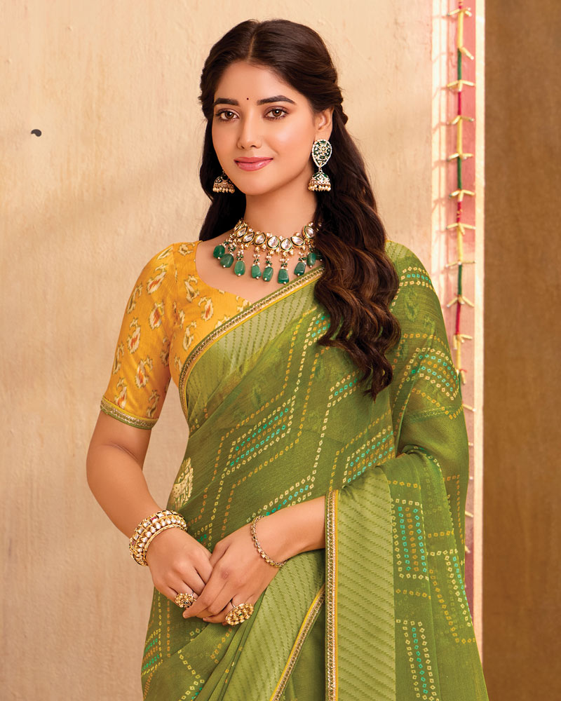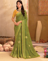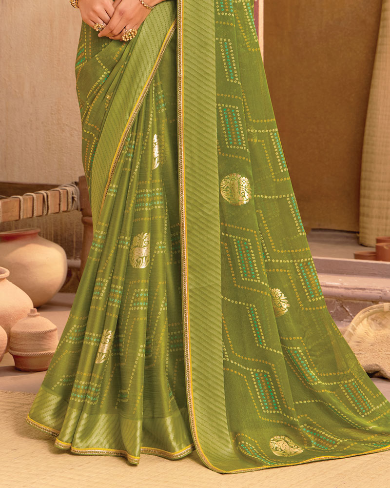Vishal Prints Dark Olive Green Printed Chiffon Saree With Foil Print And Fancy Zari Piping