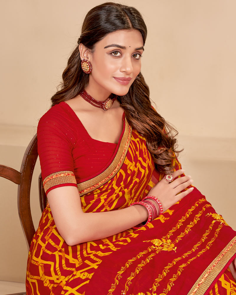 Vishal Prints Dark Red Chiffon Saree With Embroidery Work And Fancy Border