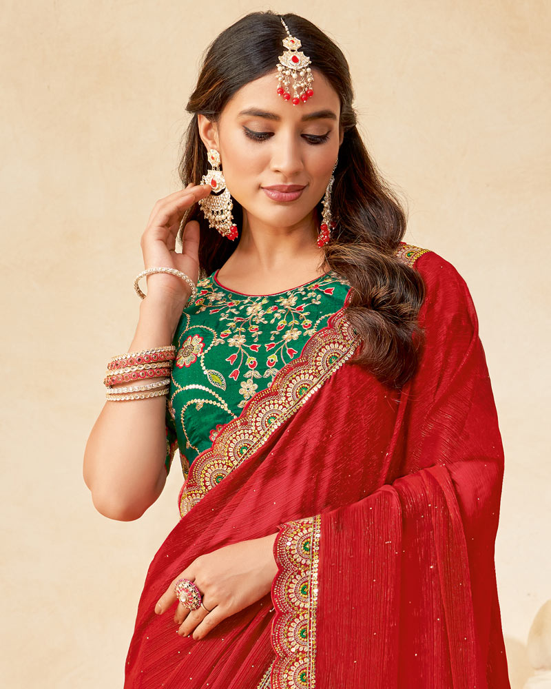 Vishal Prints Dark Red Designer Fancy Chiffon Saree With Diamond Work And Embroidery Cut Work Border