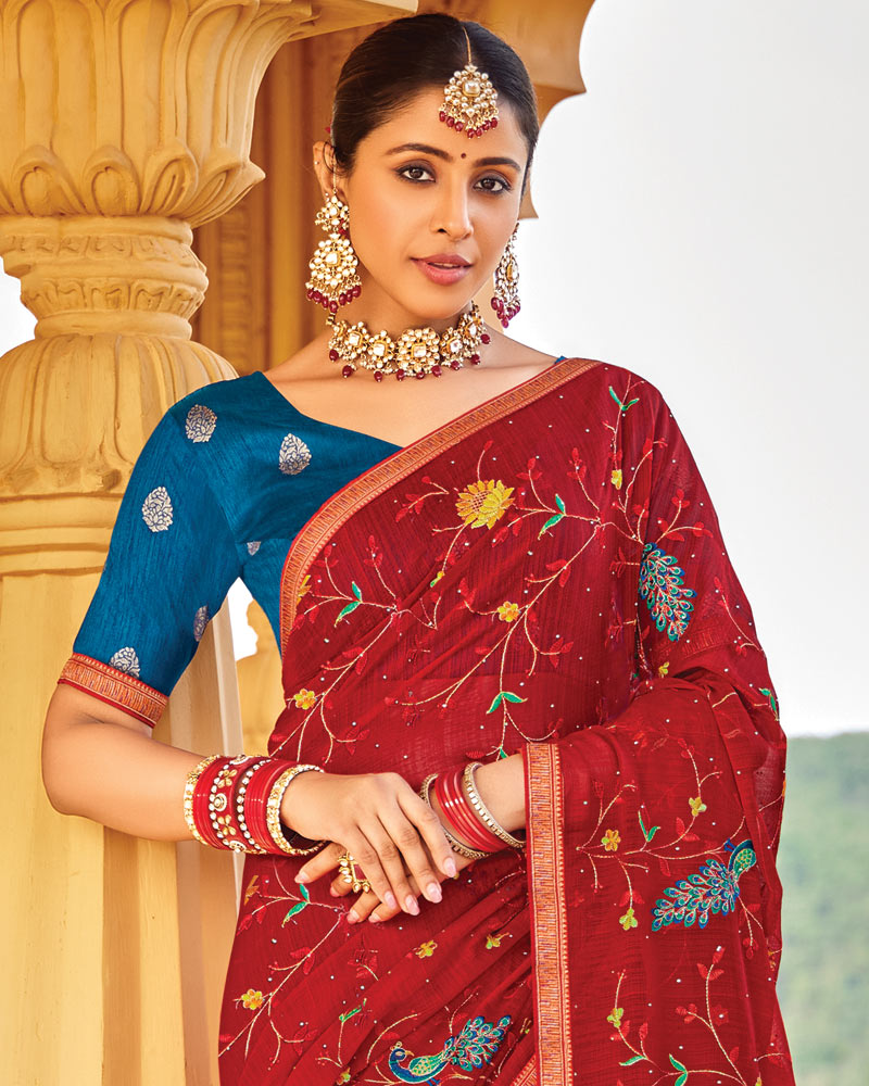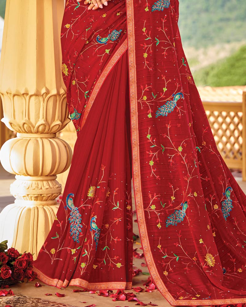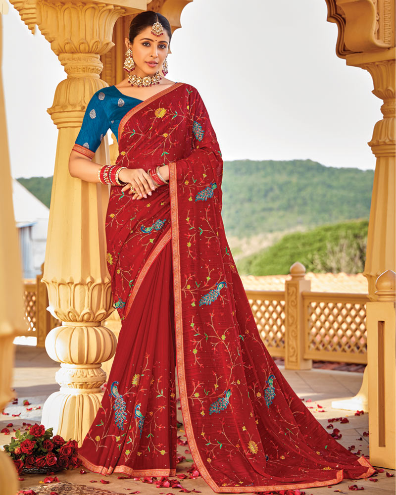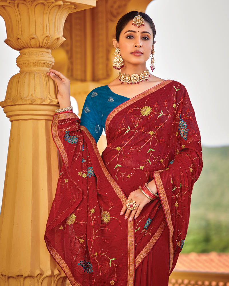 Vishal Prints Dark Red Designer Fancy Chiffon Saree With Embroidery-Diamond Work Fancy Border