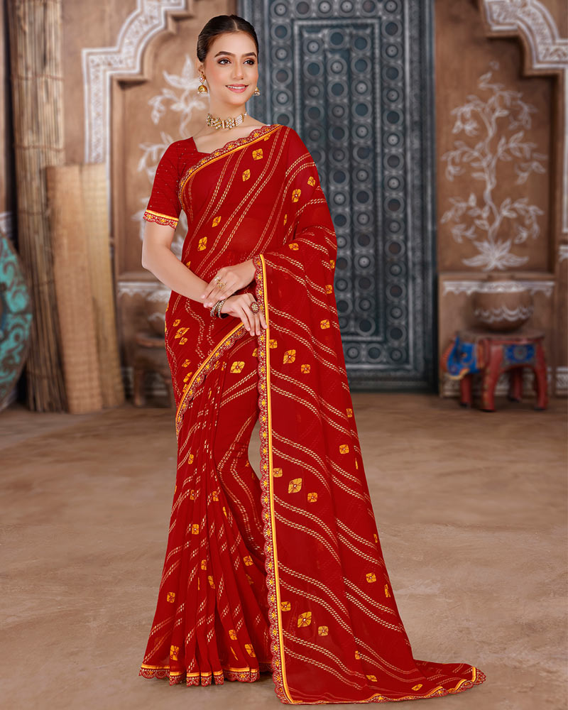 Vishal Prints Dark Red Printed Chiffon Bandhani Print Saree With Foil Print And Cut Work Embroidery Border