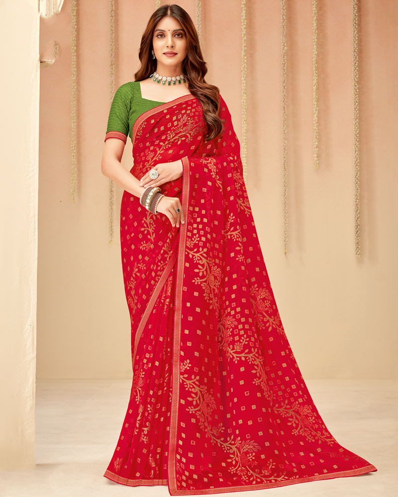 Vishal Prints Dark Red Printed Chiffon Brasso Saree With Fancy Zari Border