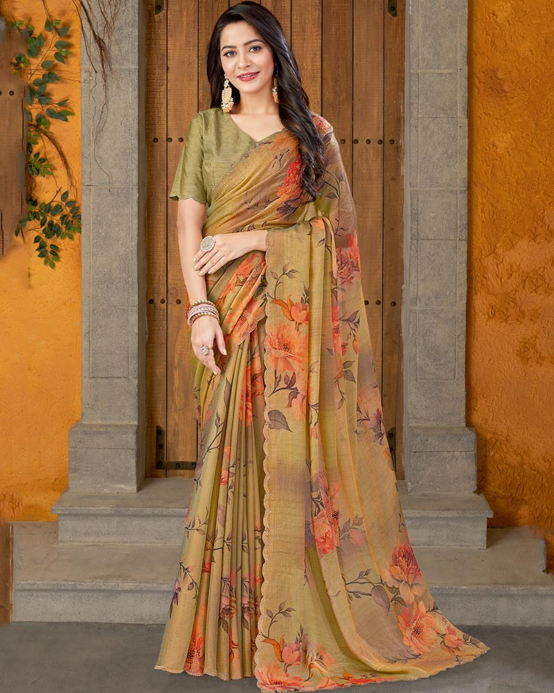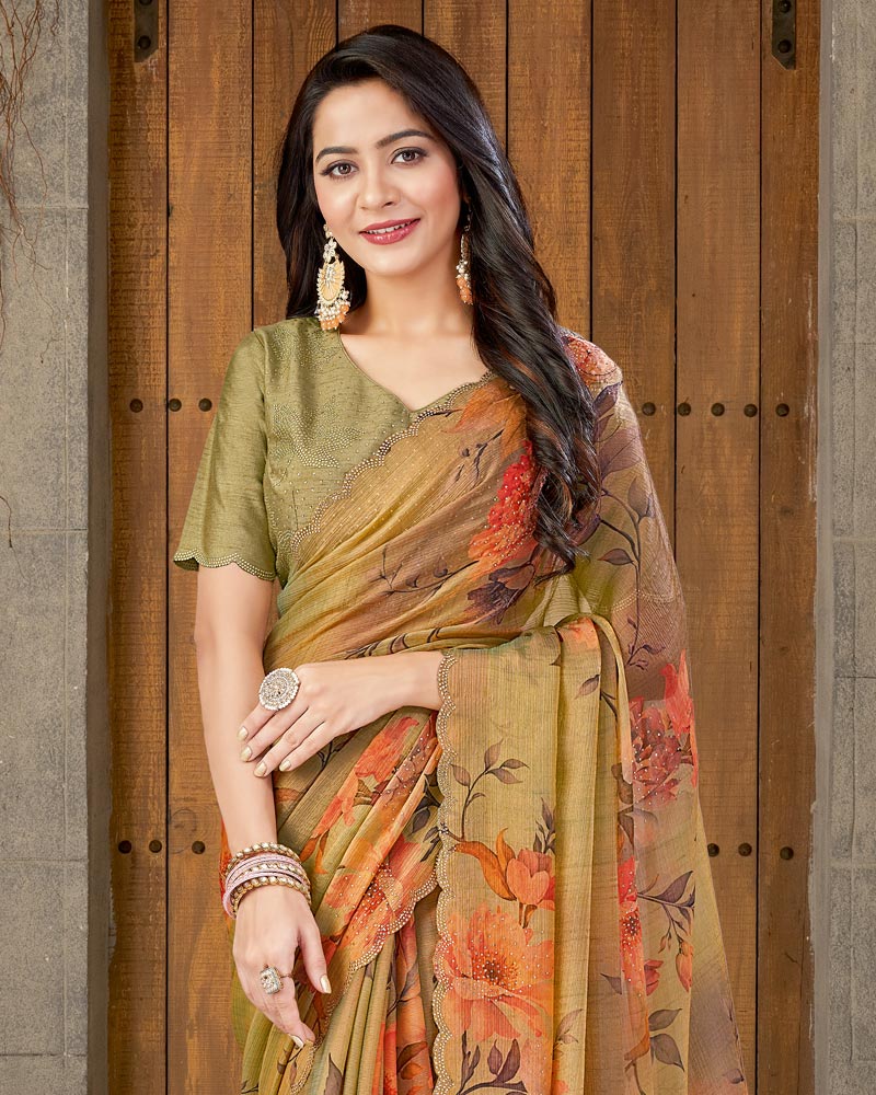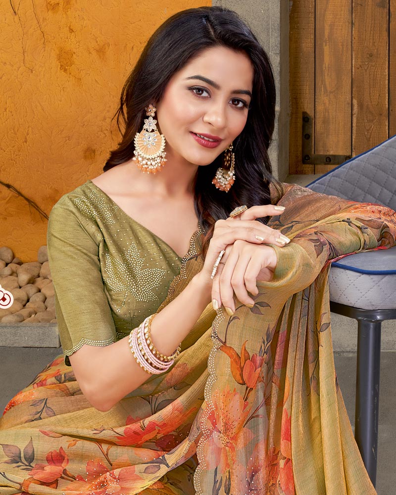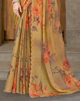 Vishal Prints Dark Sand Designer Satin Chiffon Saree With Diamond Work And Cut Work Border