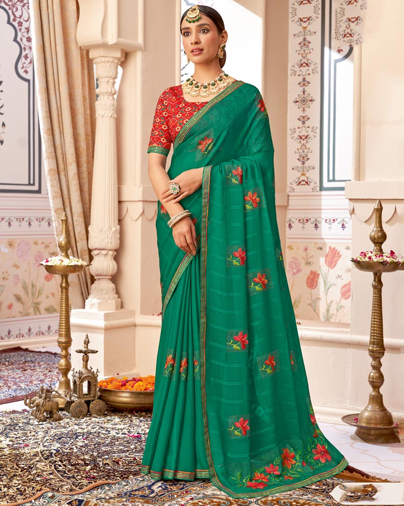 Vishal Prints Dark Sea Green Designer Patterned Chiffon Saree With Embroidery-Diamond Work And Border