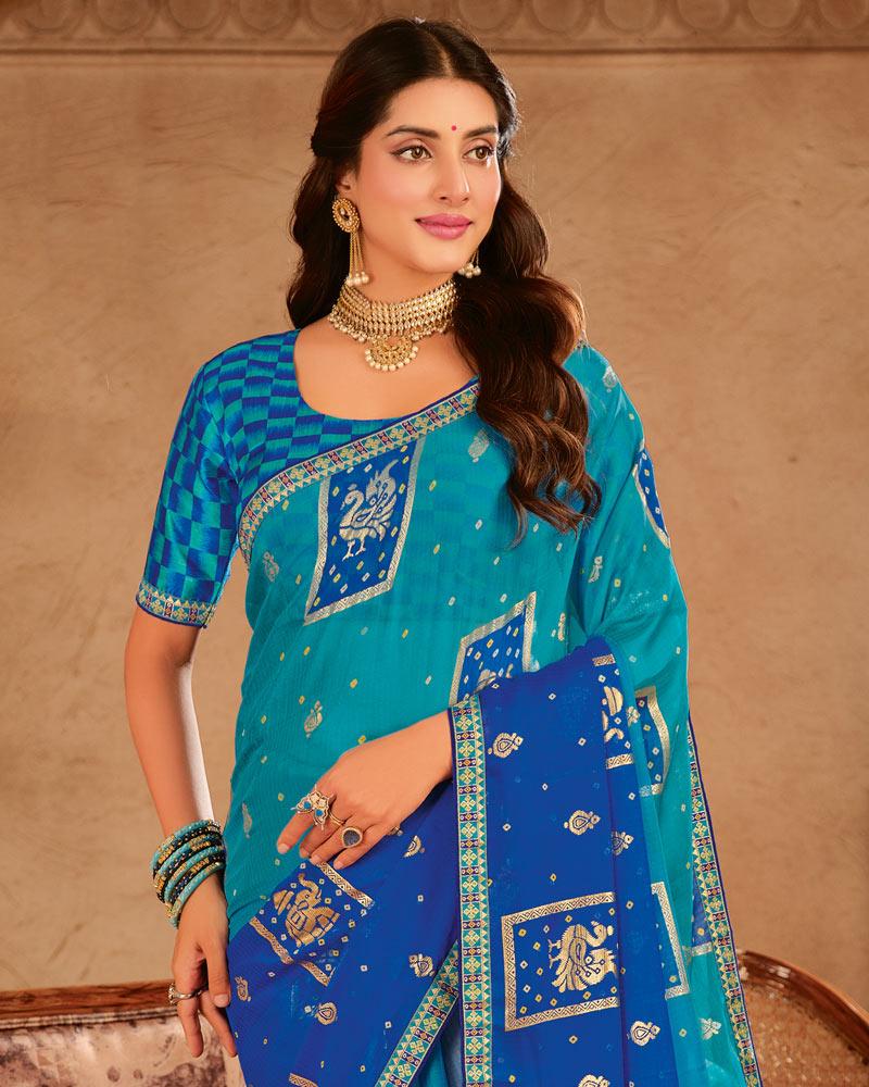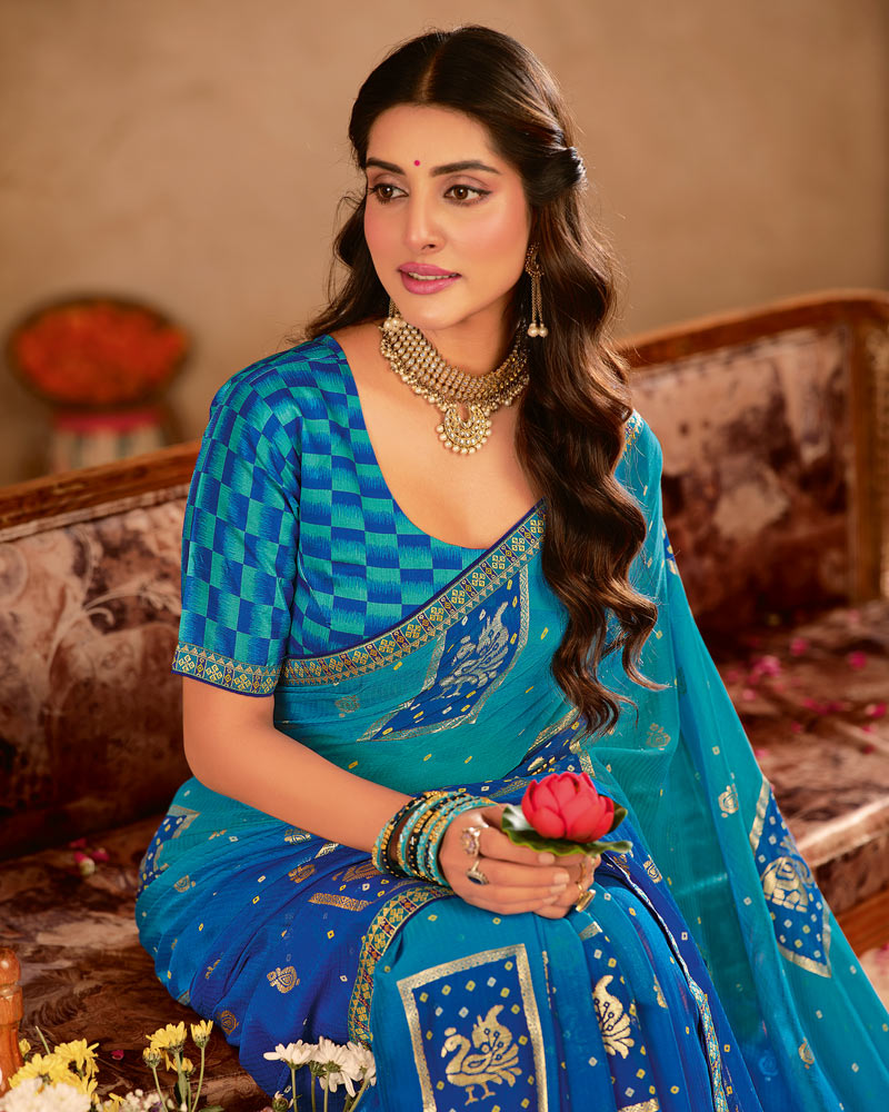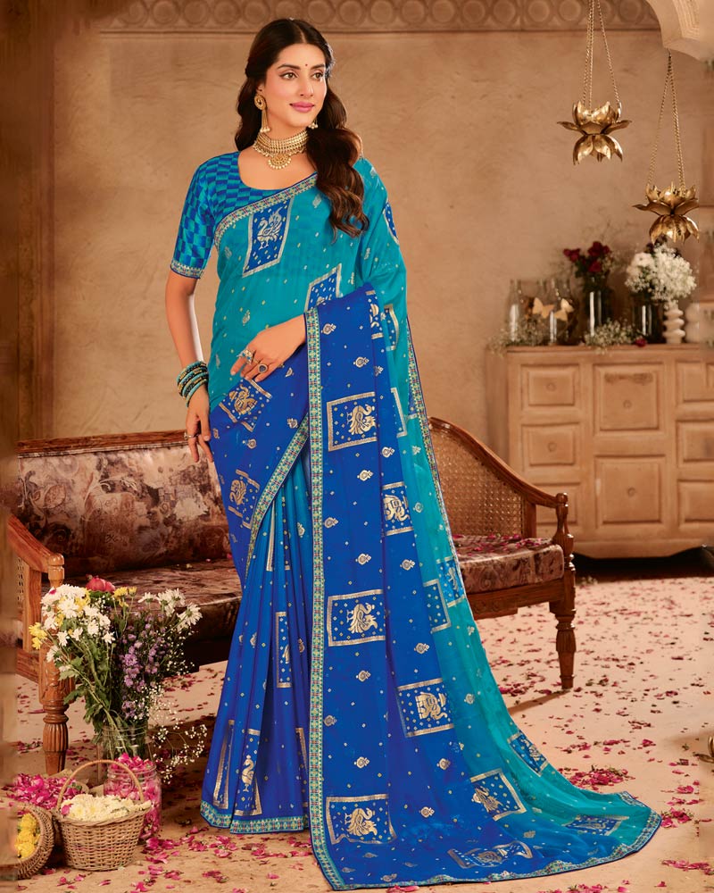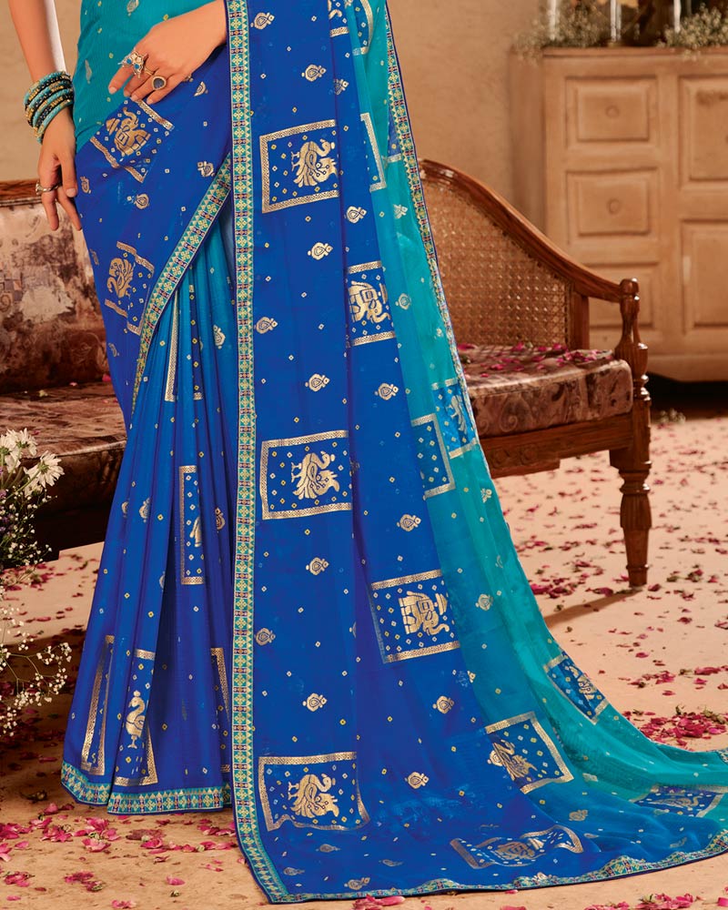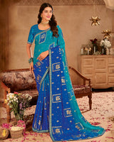 Vishal Prints Dark Sky Blue Dyed Chiffon Saree With Foil Print And Zari Border