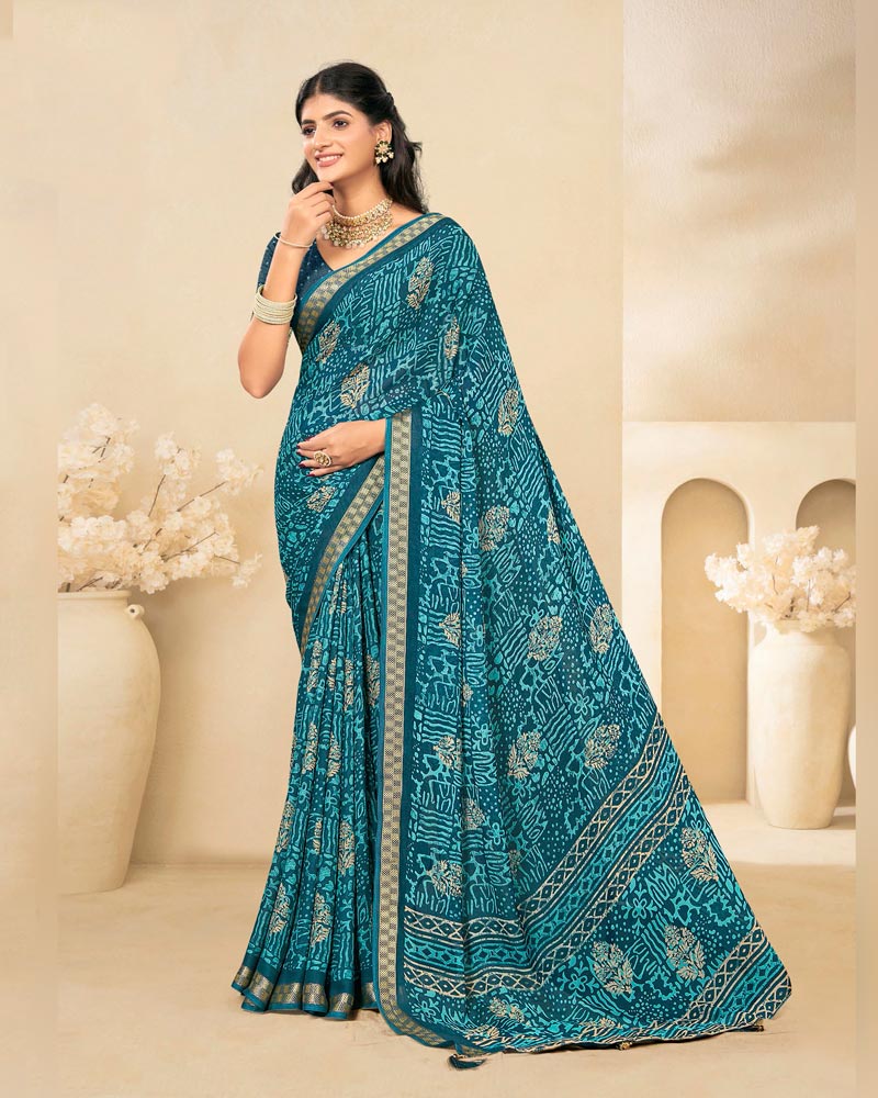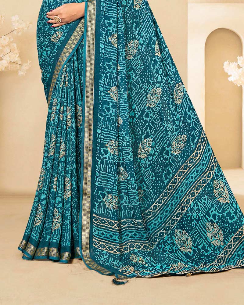 Vishal Prints Dark Teal Blue Criva Crepe Digital Print Saree With Weaved Viscose Patta