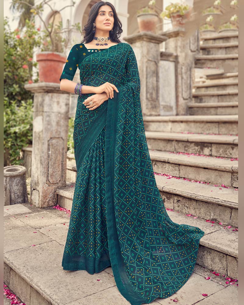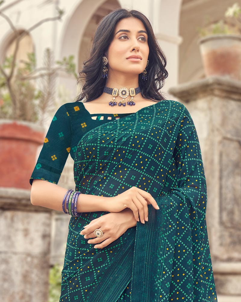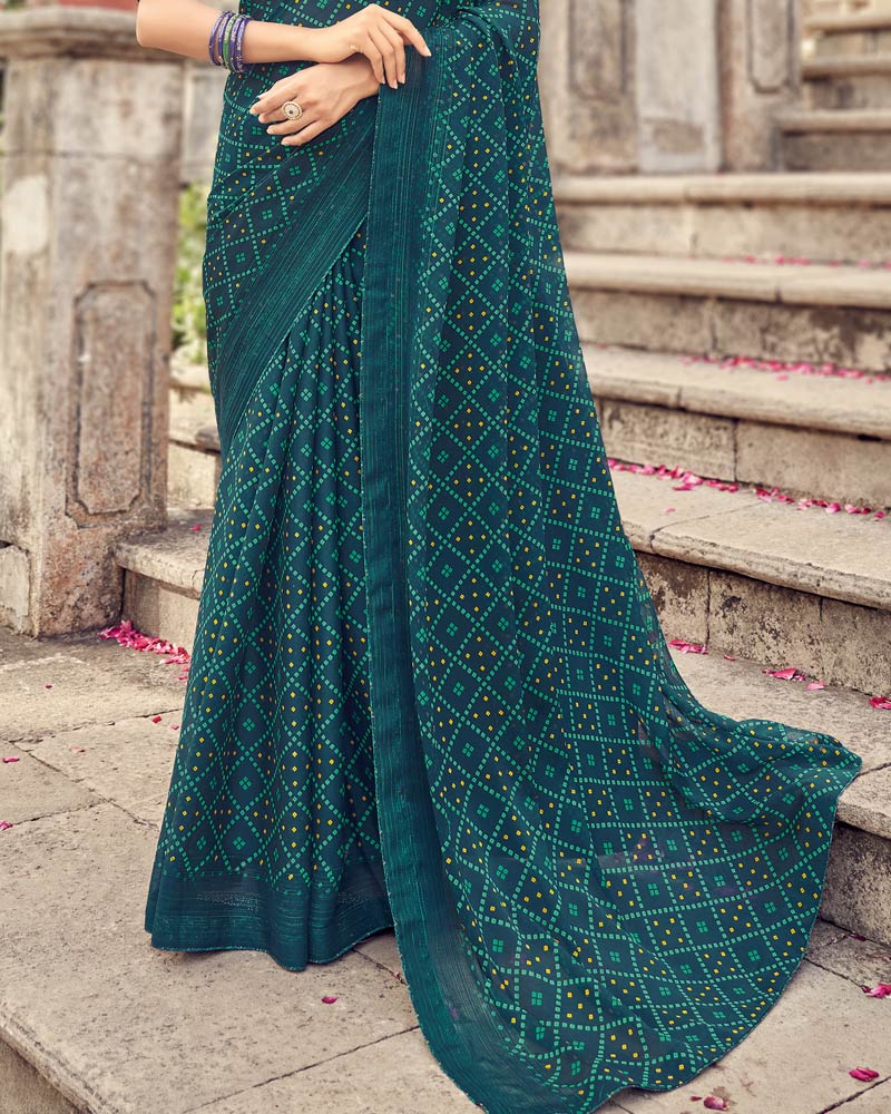 Vishal Prints Dark Teal Blue Printed Fancy Chiffon Saree With Core Piping