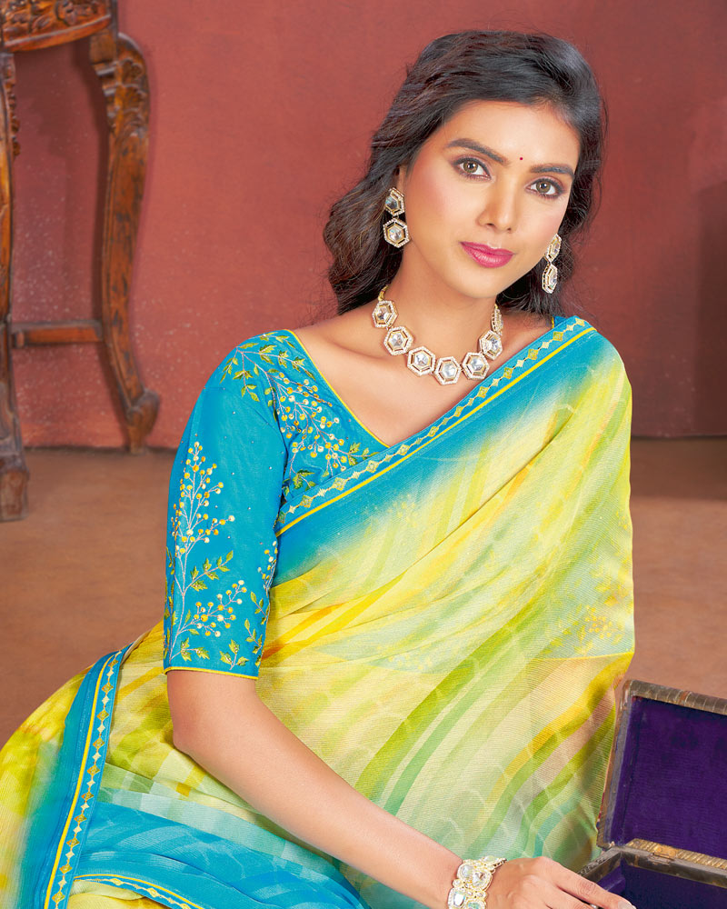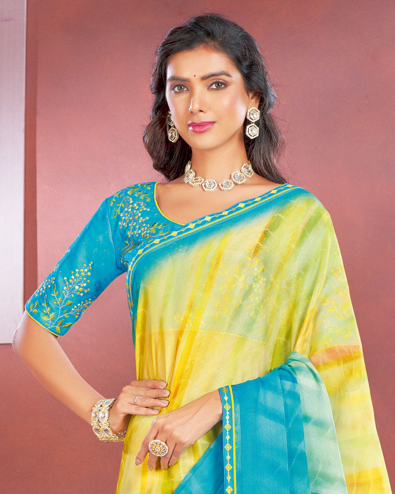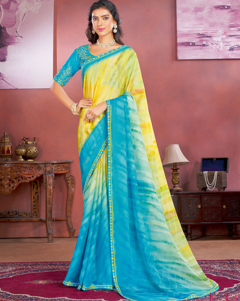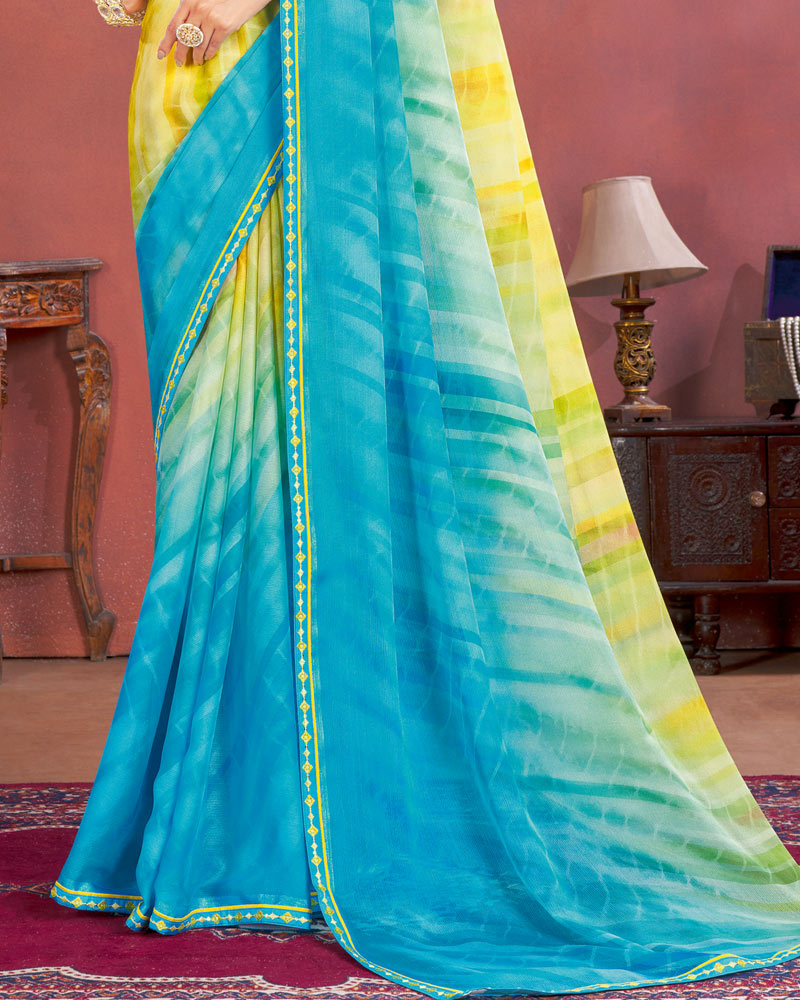 Vishal Prints Dark Turquoise Blue Designer Chiffon Saree With Fancy Embroidery Work Border