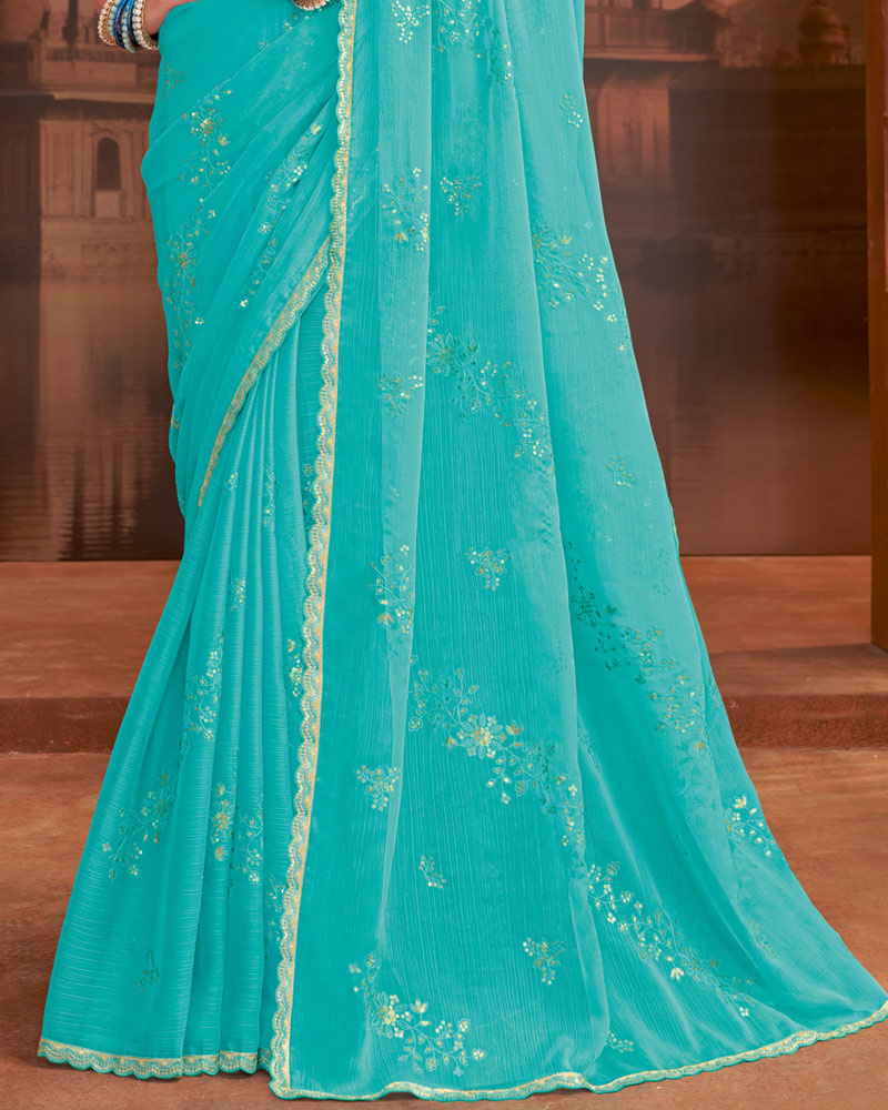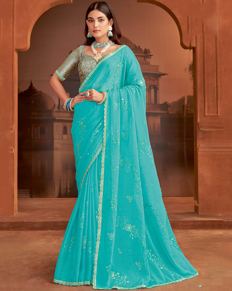 Vishal Prints Dark Turquoise Blue Designer Fancy Chiffon Saree With Embroidery-Diamond Work And Cut Work Border