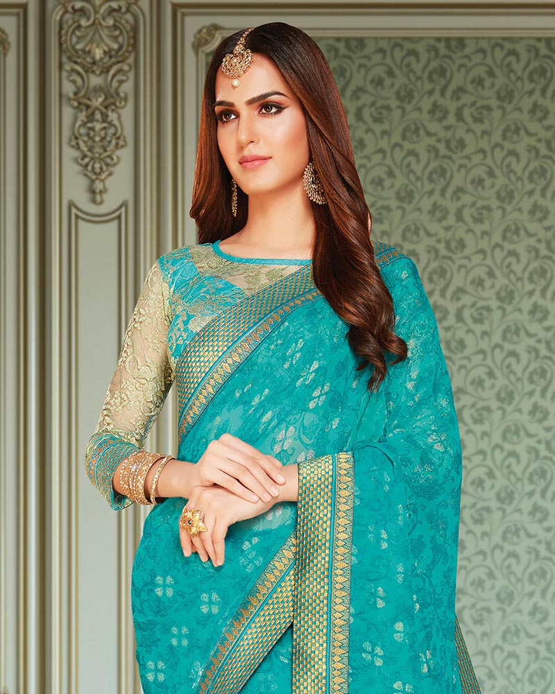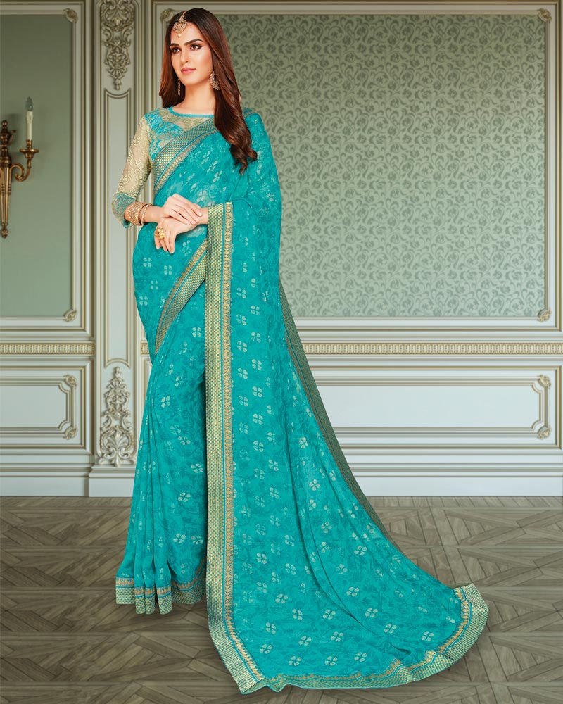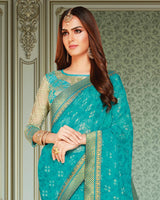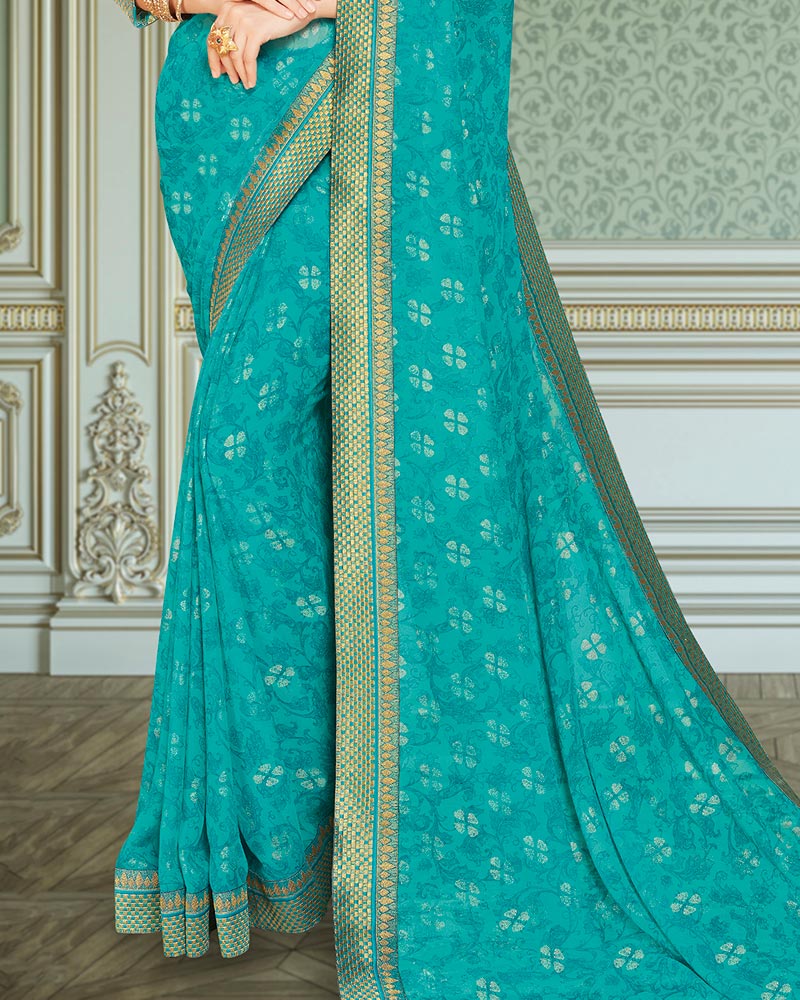 Vishal Prints Dark Turquoise Blue Georgette Saree With Foil Print And Zari Border