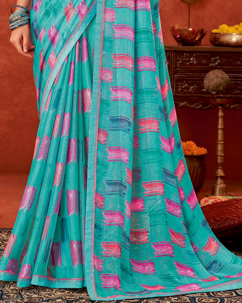 Vishal Prints Dark Turquoise Blue Printed Fancy Chiffon Saree With Fancy Border