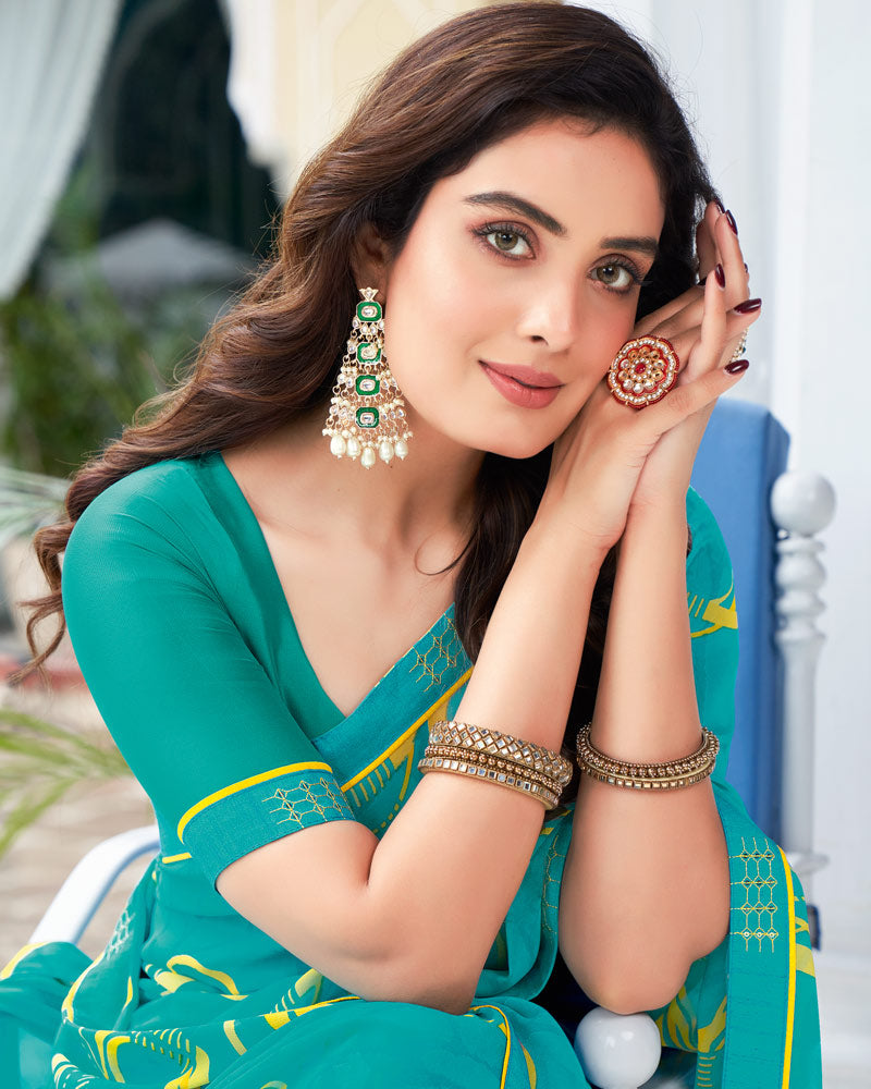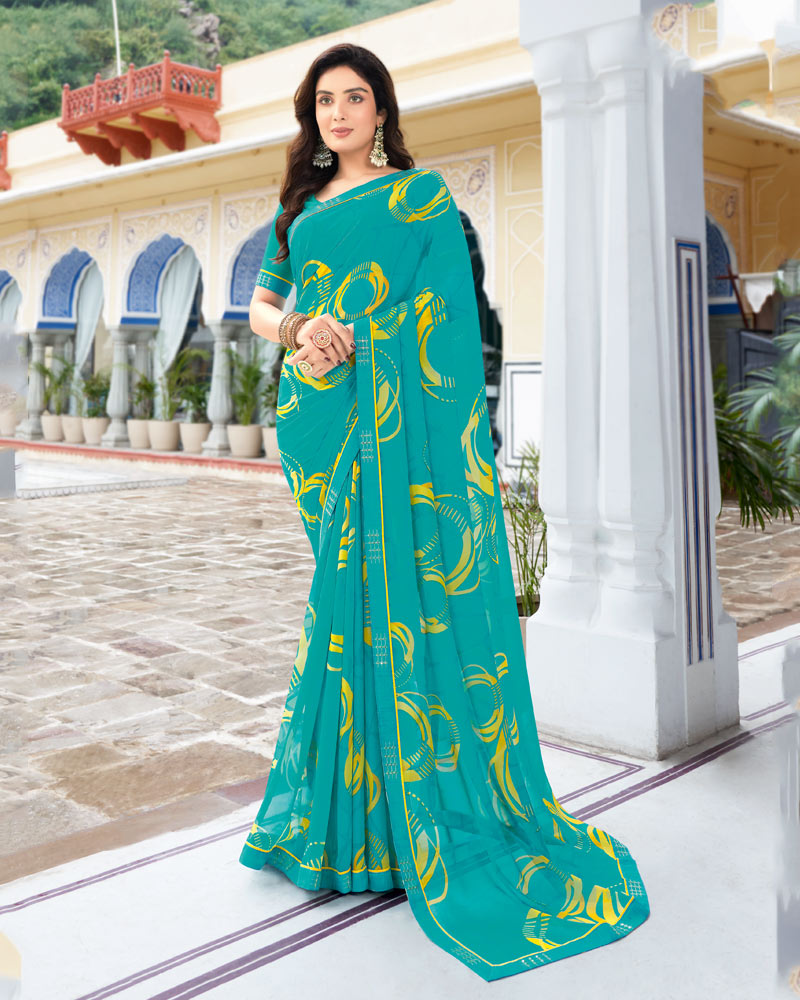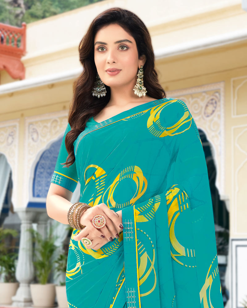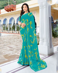 Vishal Prints Dark Turquoise Blue Printed Georgette Saree With Border