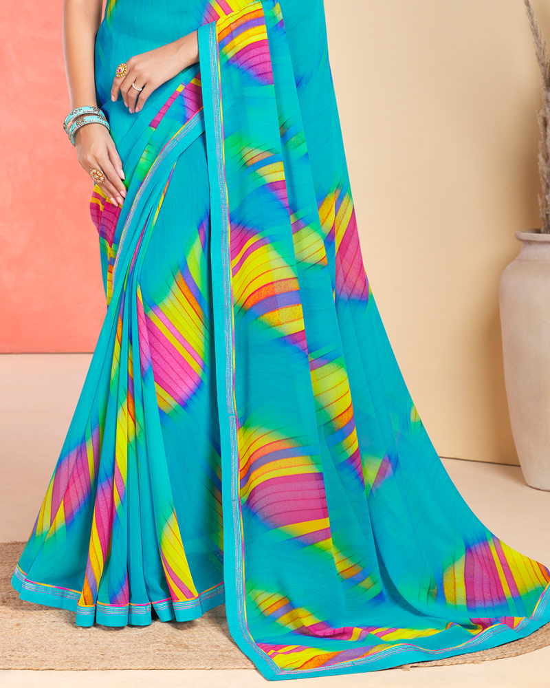 Vishal Prints Dark Turquoise Blue Printed Georgette Saree With Fancy Border