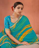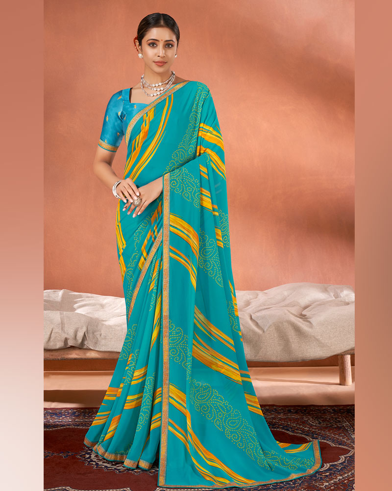 Vishal Prints Dark Turquoise Blue Printed Georgette Saree With Fancy Border