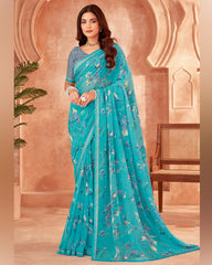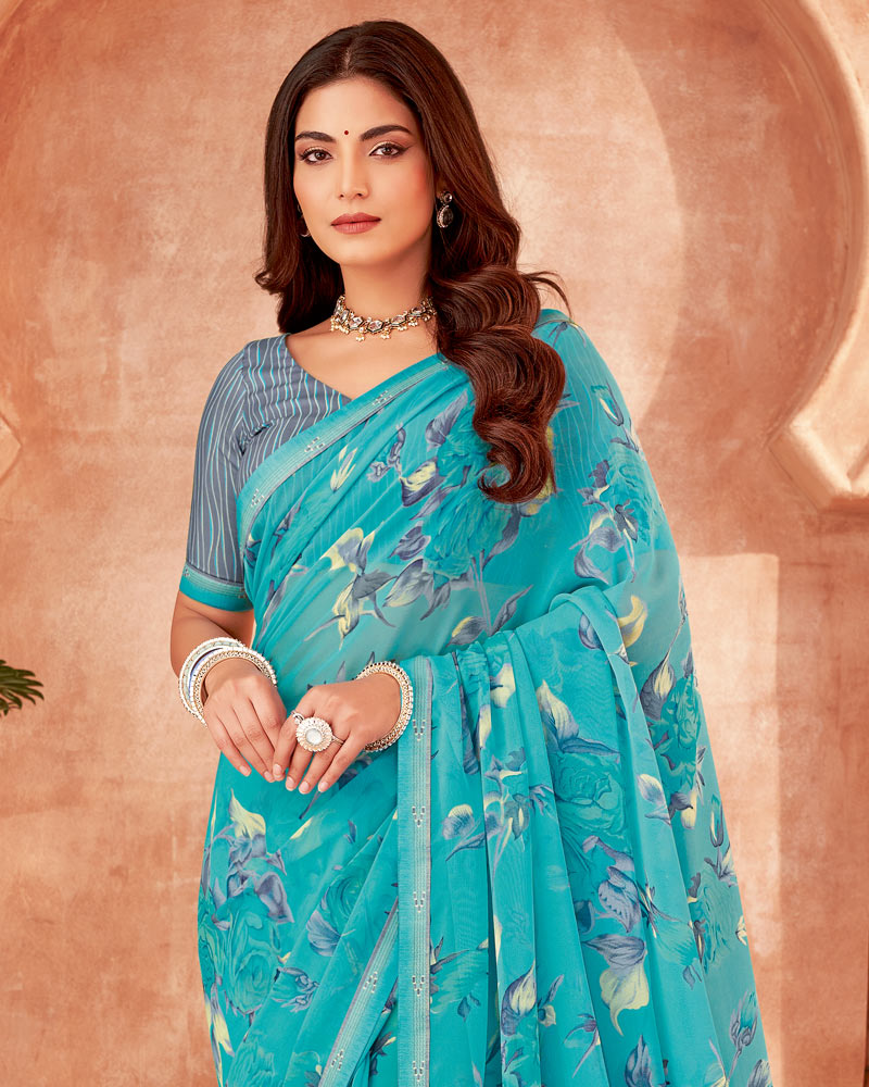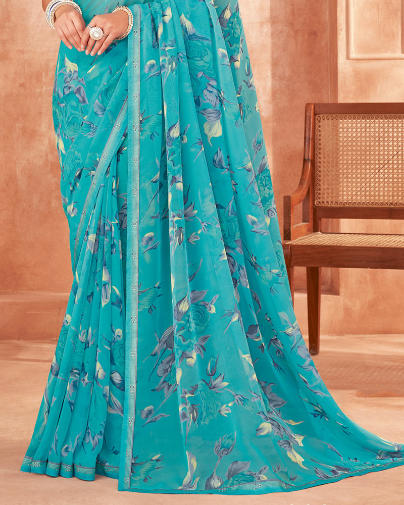 Vishal Prints Dark Turquoise Blue Printed Georgette Saree With Fancy Border