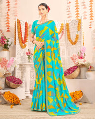 Vishal Prints Dark Turquoise Blue Printed Weightless Georgette Saree With Foil Print And Zari Border