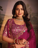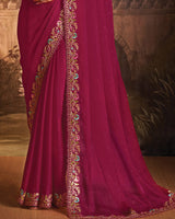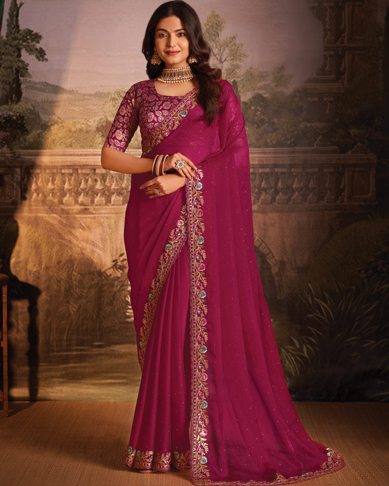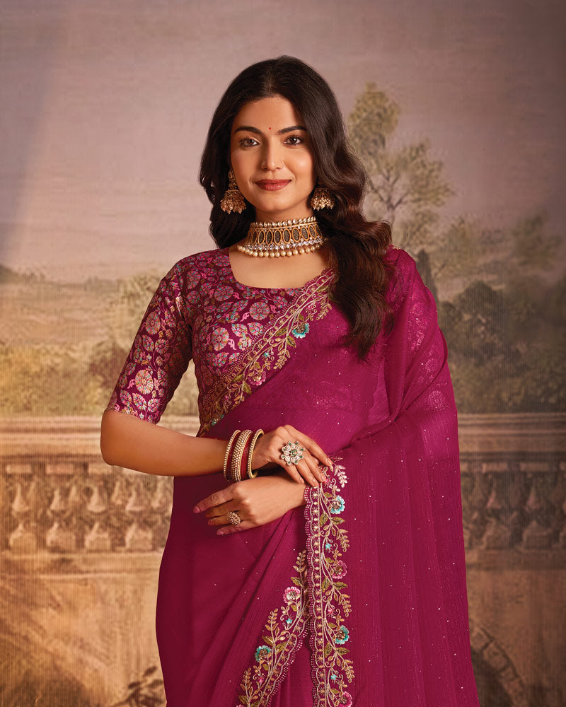 Vishal Prints Dark Wine Designer Zari-Chiffon Saree With Diamond Work And Cut Work Embroidery Border