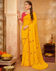 Vishal Prints Dark Yellow Designer Chiffon Saree With Embroidery Diamond Work And Core Piping