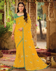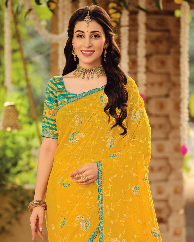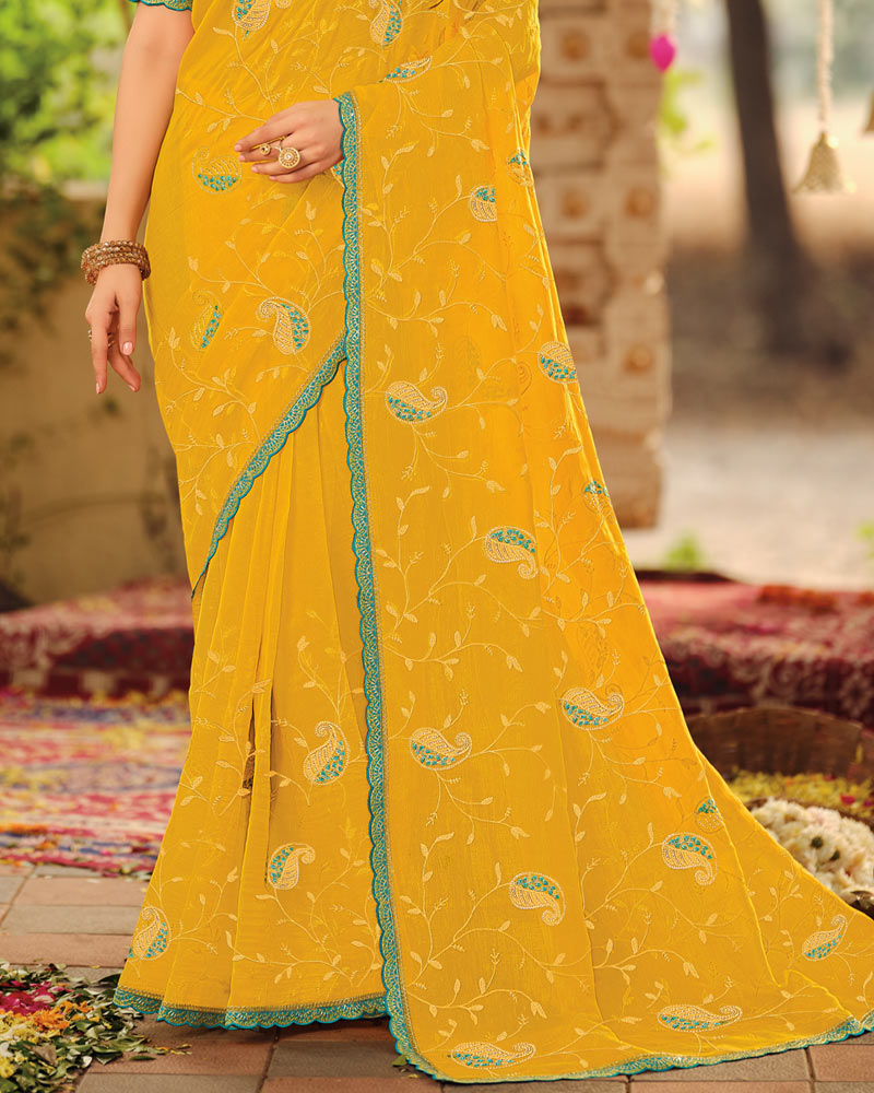 Vishal Prints Dark Yellow Dyed Designer Chiffon Saree With Embroidery-Diamond Work And Cut Work Embroidery Border