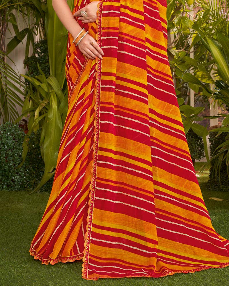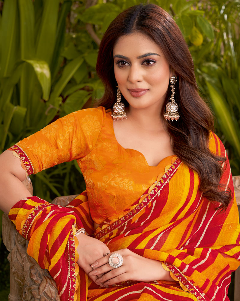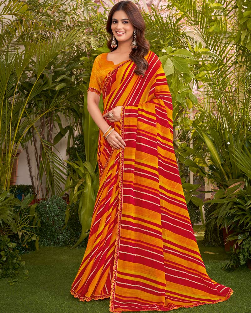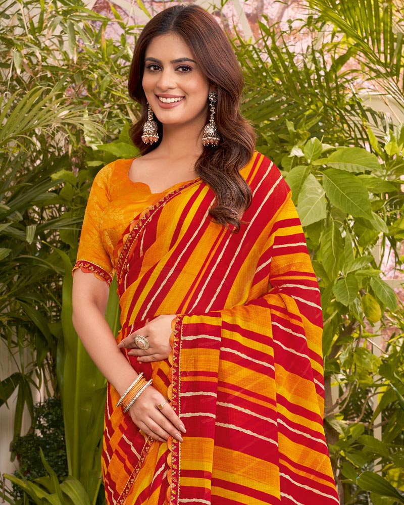 Vishal Prints Dark Yellow Printed Fancy Chiffon Traditional Print Saree With Cut Work Border