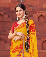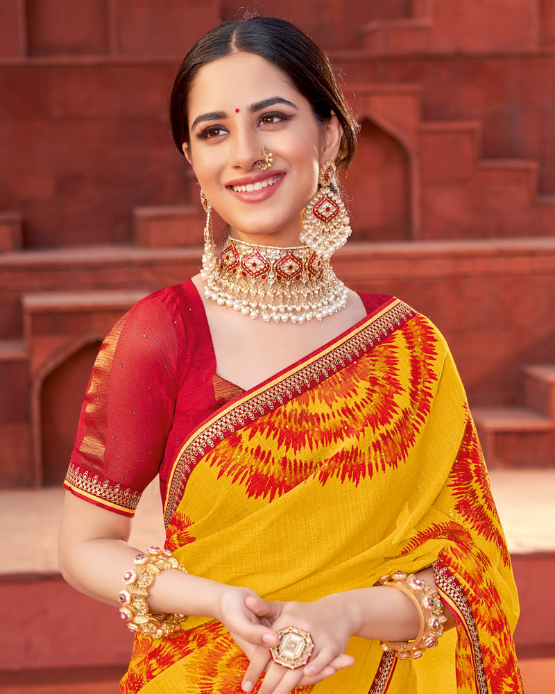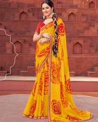 Vishal Prints Dark Yellow Printed Fancy Chiffon Traditional Saree With Foil Print And Border