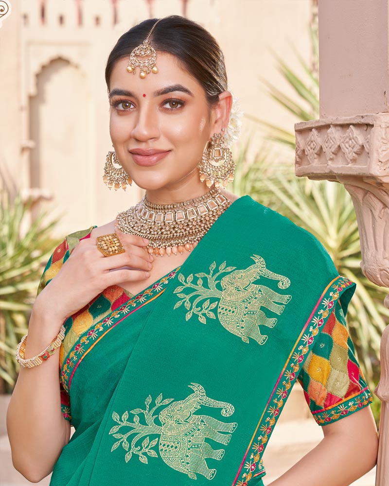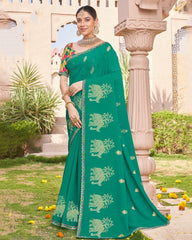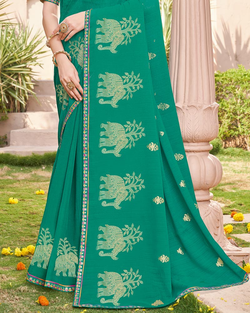 Vishal Prints Deep Sea Green Designer Chiffon Saree With Foil Print And Fancy Border