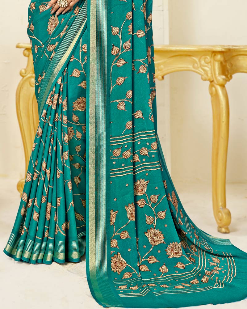 Vishal Prints Deep Sea Green Printed Criva Crepe Saree With Weaved Viscose Patta