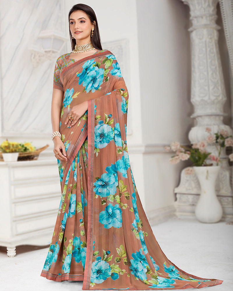 Vishal Prints Dusty Brown Patterned Chiffon Digital Print Saree With Fancy Border