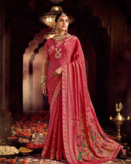 Vishal Prints Dusty Faded Red Designer Printed Pure Brasso Saree With Diamond Work-Core Piping And Tassel