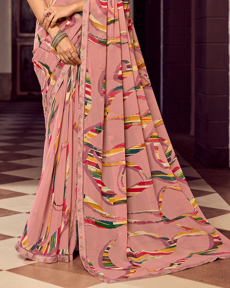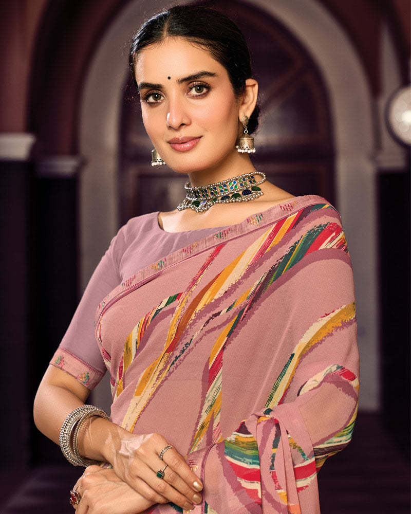 Vishal Prints Dusty Oriental Pink Digital Print Georgette Saree With Fancy Border