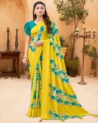 Vishal Prints Dusty Yellow Digital Print Georgette Saree With Foil Print And Weaved Satin Patta