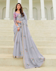 Vishal Prints French Grey Designer Organza Saree With Embroidery-Diamond Work And Cut Work Border